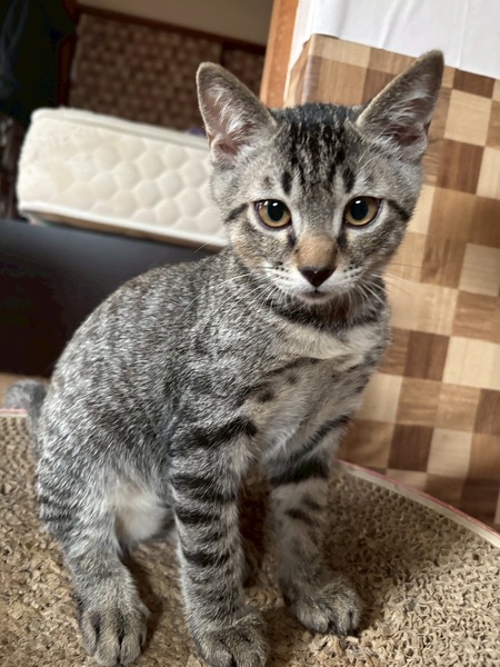 | 特徴(性格など) | グレーキジトラのきんとん。 保護時にお口を怪我していましたが完治。 それとは関係なく、ポケーっとした顔で時々寄り目に見える可愛いお顔。 安定した性格で、人馴れしています。 おやつもおもちゃも大好きで、時々甘えてきます。 寂しがり屋な一面があり、先輩猫にくっついて寝ていることがあります。 頭よりお腹を触られるのが好きです。筆のようなしっぽが長いです。 |