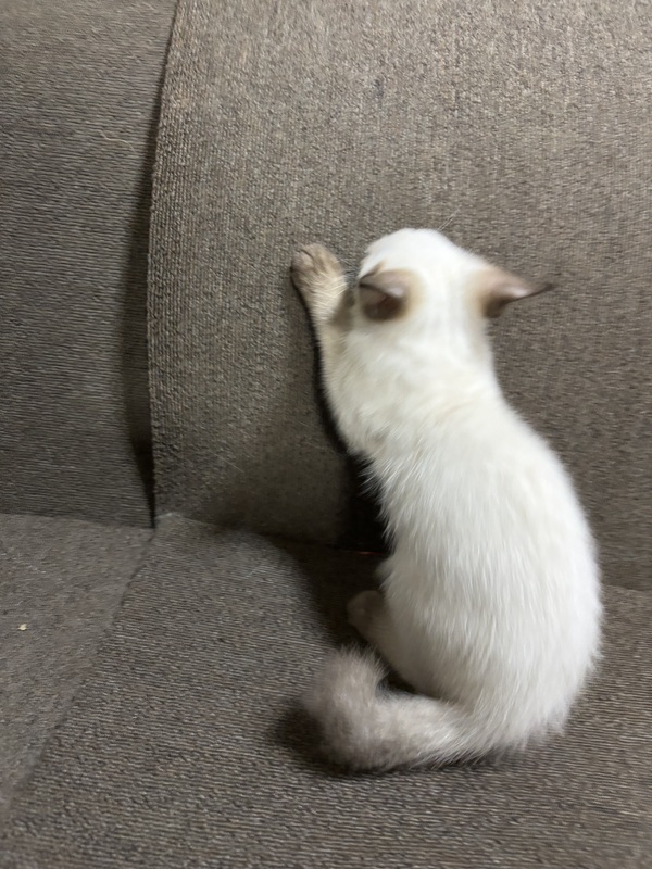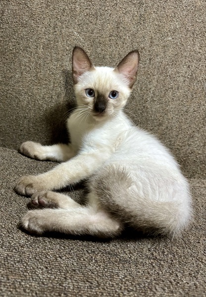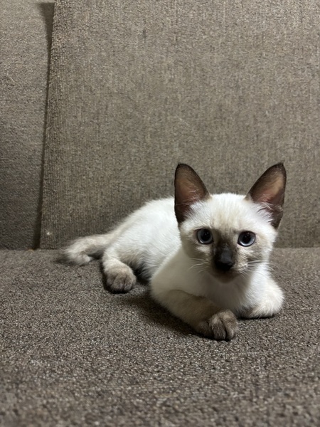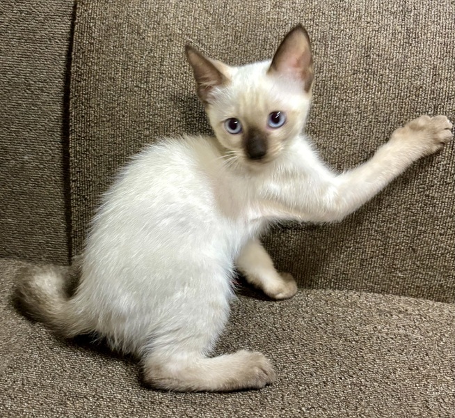 | 特徴(性格など) | 白トラ 瞳薄いブルー シッポ長いです シッポ先曲がっています 両耳、手足先、シッポ黒っぽいです 食欲旺盛、トイレも覚えました 元気に飛び回っています |