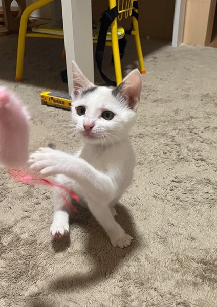 | 特徴(性格など) | 白多めの飛び三毛ちゃんです。 耳元としっぽにのみ三毛柄が入っているチャーミングな子です!! 【性格】 とても人懐っこくずっとくっついてきて腕枕と抱っこが大好きな珍しい子です笑 遊ぶのも食べるのも大好きで非常に可愛らしい子です。 |