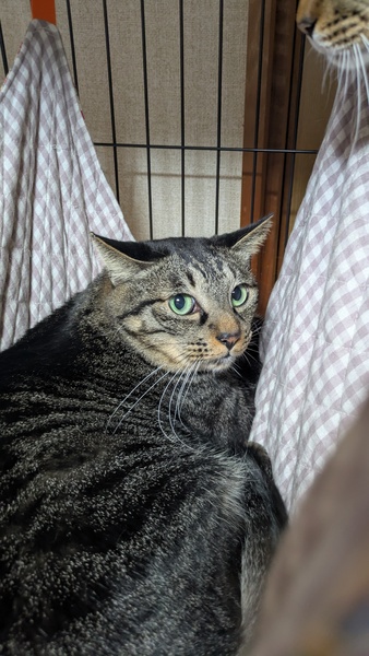 | 特徴(性格など) | グリーンの目が綺麗な、少し怖がりの大きなキジトラさんです。 | ||