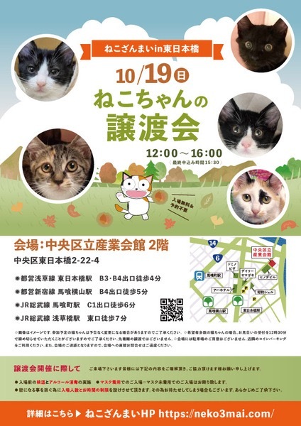| その他(譲渡条件など) | 11:30より、2階会場入口にて受付を開始します。 受付時に入場予定時間が記入された整理券をお配り致しますので、整理券を受け取った方はお時間になりましたら2階会場入口に番号順にお並び下さい。 ※11:30より早くいらしてもお待ちいただく場所がございません。 また、近隣にお住まいの方や他階フロアのご利用者様にご迷惑となる場合がございますので、受付開始時間にあわせてお越しくださいますよう、何卒ご協力お願いいたします。 ※ねこざんまい譲渡会は、先着順で里親様を決定する譲渡会ではありません。 先に申し込みをした方を優先することもありません。 お話をして、その猫ちゃんに合ったおうちに決めさせていただいております。 12時に開場し、里親様の決定は14時以降となります。 14時以降にご入場の場合、希望の猫ちゃんが決定している可能性があります。 また1頭に対し多数のご希望をいただいた場合、早めに申し込みを締め切らせていただく場合がございますので、予めご了承下さい。 里親様決定は14時以降となります。 その後、迎え入れ準備の説明等のお時間も頂戴しますので、お時間に余裕を持ってご来場下さい。 ~~~~~~~~~~~~~~~~~~~~~~~~~~~~~~ ★仔猫ご希望の里親様★ 仔猫ちゃんたちは、まだ体がしっかりしていない赤ちゃんです。 下痢だけでも数時間対応ができなかっただけ死に至る事もあります。 その為、月齢に応じたお留守番時間を設けさせていただいております。 また、子猫ちゃん(6ヶ月未満)の里親様には子猫支援金のご協力をお願い致しております。 ★猫ちゃんとのお見合いは譲渡会で!★ ねこざんまいの猫ちゃんは譲渡会でのお見合いのみとなります。 『この子はいつ譲渡会に参加するの?』『譲渡会場の場所はどこ?』などは、ねこざんまいホームページをご覧ください。 https://neko3mai.com/ ★楽しく猫ちゃんと触れ合って★ ねこざんまい譲渡会は、猫ちゃんも里親様も保護主も笑顔で過ごせる譲渡会を目指しています。 これから20年以上、楽しい時も、悲しい時もいつも傍にいてくれる大切な家族になる猫ちゃんです。 会場には沢山の猫ちゃんがいます。 1匹1匹、触れ合って猫ちゃんとお話してください。 『初めて猫ちゃんを家族に迎える方』 『先住猫ちゃんのお友達を迎える方』など トライアルの仕方や先住猫ちゃんと仲良くなるコツなど経験豊富な保護主やスタッフにお気軽にご相談ください! 猫を愛し、そして猫に愛されている猫好きスタッフと保護主がアドバイスさせていただきます。 ★里親希望のみなさまへ★ ペットではなく、家族一員としてたっぷり愛情を注いでくださるご家庭をお待ちしております。 恐れ入りますが ●学生の方 子猫・幼猫希望の60才以上の方のみのご家庭 ●脱走防止対策にご協力いただけない方 は原則譲渡を遠慮させていただいております。 ●一人暮らし・同棲(事実婚)の方 保護主の希望や猫の年齢・性格等により、ご希望に添えない場合もございます。 参加猫ちゃんは、それぞれ保護主(実際に猫ちゃんを自宅に入れ、保護をしている方)が異なります。 詳しい条件なども異なる場合がございますので、会場内で直接保護主とお話ください。 〖共通条件〗 1.終生飼育 2.完全室内飼い 3.脱走防止対策へのご協力 4.避妊去勢手術 5.契約書類へのサイン 6.定期報告 7.医療費等の負担 当日の猫ちゃんを連れて帰ることはできません。後日、保護主が里親様のご自宅までお届け致します。 その為、移動の際の猫ちゃんの負担を月齢などから考慮し、お届け地区を限定させて頂くこともございますのでご了承ください。 ご理解とご協力のほど宜しくお願い致します。 ☆よくある質問☆ ・譲渡の条件 ・ご負担頂く費用 ・譲渡会の場所等は ホームページに詳しく掲載させて頂いておりますのでご覧ください。 https://neko3mai.com/ メールでのお問い合わせはすぐにご返答出来ない場合がございますのでご了承ください。 ホームページ https://neko3mai.com/ お問い合わせ http://www.neko3mai.com/contact/form_general.html ねこざんまいブログ http://ameblo.jp/neko3mai/ |