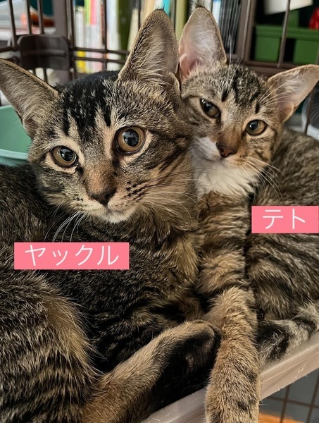 | 特徴(性格など) | ヤックル メス 2025/05/01ごろ生まれ マイクロチップ済 8427 ワクチン 1回目8/26済 2回目9/20済 エイズ白血病陰性。 11/16避妊手術。 テトとはたぶん姉妹 怖がりで初めましてからしばらくはシャーしますがわりとすぐに馴れます。 点眼時もおとなしくだっこされてとても可愛いです。 |