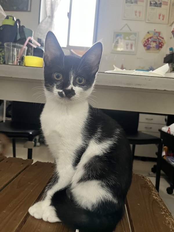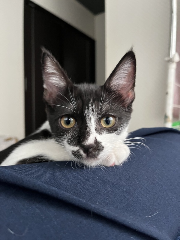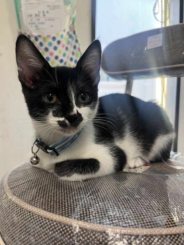 | 特徴(性格など) | ハチワレのちょび髭風柄がちょっとお茶目な子です ミルクボランティアさんが育ててくださった子なので人慣れ抜群!人大好き! 甘えん坊すぎるくらいなので、甘えてほしいタイプの猫好きさん募集中! 混合ワクチン2回接種済み ウイルス検査、両方陰性 マイクロチップ装着済み |