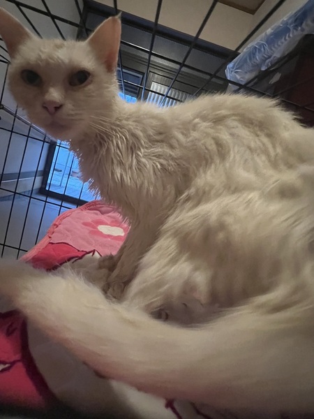 | 特徴(性格など) | 色:白 性格:誰にでも人懐っこい、甘えん坊、食いしん坊 体格:ガリガリ 特徴:尻尾や手足が長め 栄養が行き届き始めて肉が着き始めるとデカくなりそうな子です。 ノミが着いており、現在治療中です。 目ヤニやけしており、目の周りが少し茶色いです。 家に既に猫がおりますが、先住猫に物怖じしないで近付いていくタイプの子です。 両足の指の爪が1本ずつ取れて出血していました。 肉球や体部分に少し怪我あります。 ※現在体調が万全ではいない為、病院には連れて行けておりません。 |