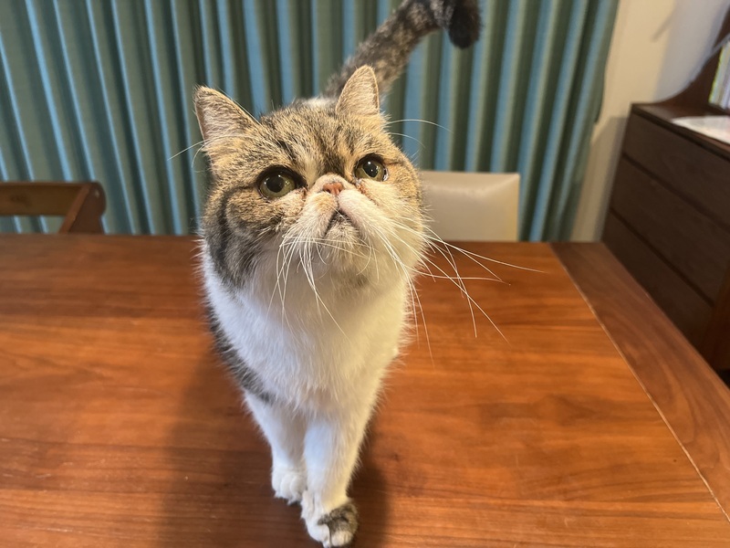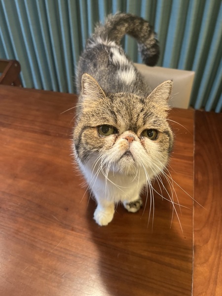 | 特徴(性格など) | 色柄:プランタビー&ホワイト 性格:穏やかです。客が家に来ても、怖がりもせず、興味深々で臭いを嗅ぎに来たり撫でてもらおうとする猫です。遊ぶのも好きです。飼い主に噛んだり、引っ掻いたりしたことはありません。爪切りはやや嫌がりますが、ブラッシングは好きで積極的にさせてくれます。エキゾチックショートヘアの特徴で目ヤニが出やすいという特徴があり、毎日清拭は必要です。 |