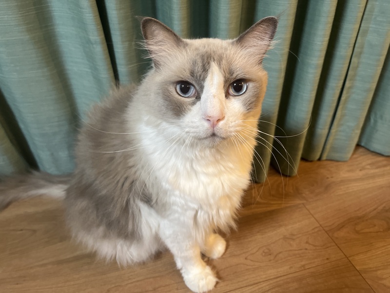 | 特徴(性格など) | 色柄:ブルーポイントバイカラー 性格:甘えん坊で穏やかです。機嫌が良い時は抱っこもさせてくれます。遊び好きだけど、やや食いしん坊な一面もあります。甘噛みはしますが、本気で噛まれたことはありません。よく日向ぼっこをしています。他の猫とも仲良く過ごしています。 |