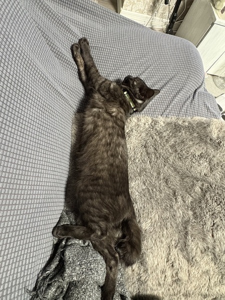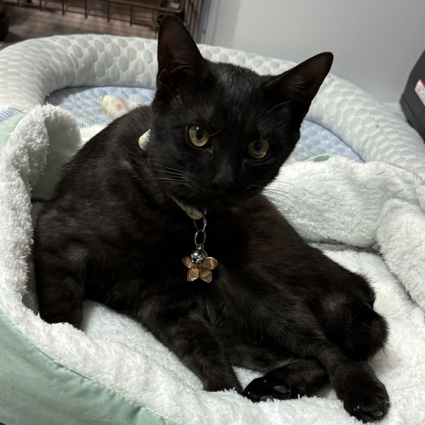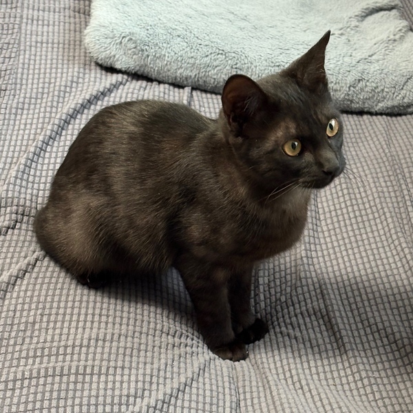 | 特徴(性格など) | 黒毛なのですが少し薄目で黒い虎模様が見えています。 とても人懐っこい性格です。 猫じゃらしが大好きで飛び跳ねて遊んでいます。 姉妹の子猫が先に里親様に譲渡となり、じゃれる相手がいなくなり人と遊んでいると甘噛みが出たりします。 |