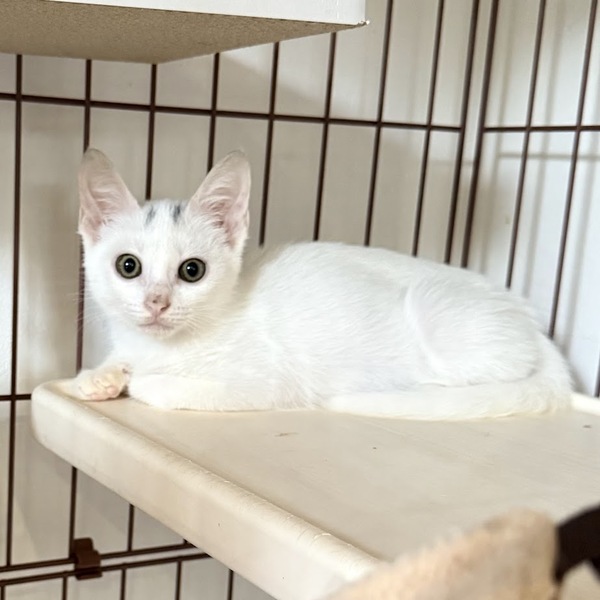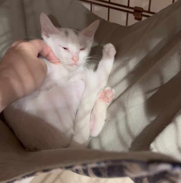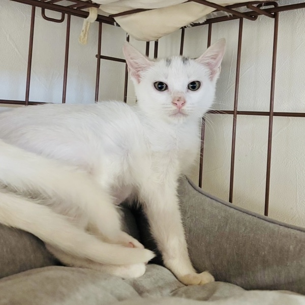 | 特徴(性格など) | 頭にハの字の模様が入っている白猫のはのじ。 3姉妹の中でいちばん体が小さいですが、いちばん気が強そうです。 まだ慣れていないので、触ると怒ることもありますが、どんどんと、甘えたに変貌しそうな気がします。 毎日、人馴れトレーニングをがんばっています。 |