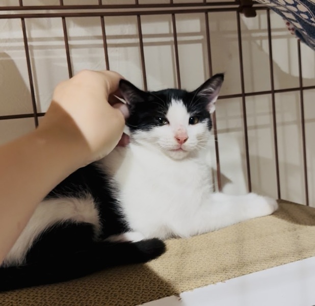 特徴(性格など) | 姉妹の中で唯一の白黒でハチワレのもみじ。 3姉妹の中でいちばん穏やかで、はじめから触っても怒らないこです。 撫でると気持ちよさそうにしているので、もう少し慣れたら、自分からこちらに来てくれるようになりそうです。 手をおもちゃにして遊ぼうとするので、それはダメだよと教えながら、毎日、人馴れトレーニングをがんばっています。 |