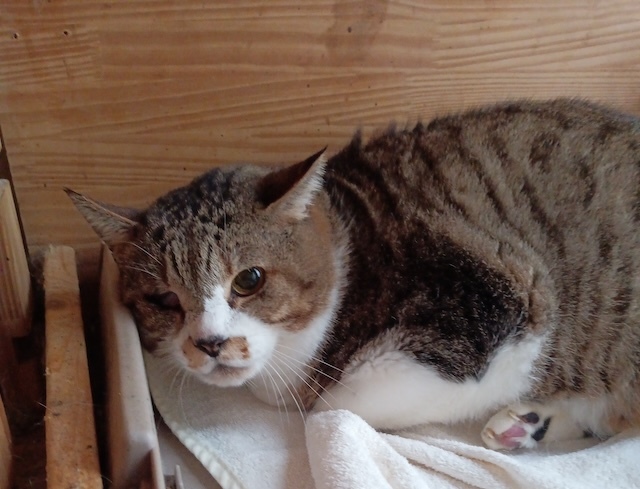 | 特徴(性格など) | ☆☆☆ご希望の方は、以下のアンケートフォームにご記入の上、送信してください☆☆☆ ねこ親希望アンケート→ http://chibawan.net/contactform_cat 【猫No】3984 【愛称】是(これ) 【性別】オス 【年齢】推定6才(19/04/11頃生) 【毛色】キジ白 【体重】4.7kg(25/10現在) 【状態】両下肢支障あり、去勢手術済、ワクチン接種済(25/03/25)、血液検査(エイズ陽性・白血病陰性)、マイクロチップ装着済、検便駆虫済、ノミダニ駆除済、トイレ認識なし 【預かり場所】神奈川県三浦郡葉山町 【日記】「チビスケんち」(インスタグラム) https://www.instagram.com/chibisukehaha/ 【経緯】千葉県動物愛護センターより引き取り 【性格】まだまだ人が怖いようで撫でると一生懸命威嚇してきますが、移動当初よりは威嚇は穏やかになってきました。 歩くことはできますが両後ろ足は何かしら障害があるようで特に左足は引きずるような素ぶりで移動しています。ジャンプはおそらくできないと思われます。 足に障害があるためか認識がないのかトイレは使ってくれません。排泄は自力でできますが、たまに排尿がなかったり少ない時は圧迫排尿していますが、その際はおとなしくお腹を押させてくれます。 どこででも排泄してしまうので現在は限られたスペースで過ごしていますが、人の出入りが怖いこともあり、ほぼ一日、同じ場所で寝ています。 食欲はあり、最近やっと近くにいてもご飯を食べてくれるようになりました。 甘えたり人の前でも寛ぐ姿を見せてくれるにはもう少し時間がかかるかもしれませんが、移動当初よりは穏やかな面も見せてくれるようになったのできっと段々と変わってくれると思います。 このような状態の是のすべてを、丸ごと是の個性と思っていただける方とのご縁を心からお待ちしております。 【その他】愛情いっぱいの終生飼養、完全室内飼育、細心の脱走防止対策、定期的なワクチン接種などの健康管理、定期的な近況報告をお約束いただける神奈川県近郊のお留守番の少ないご家族で、アンケートに快くお答えいただける方からのお問い合わせを心よりお待ちしております。 |