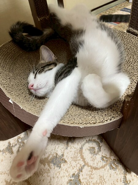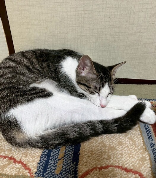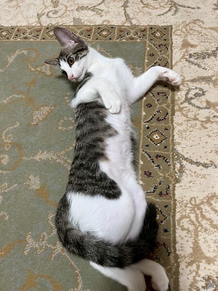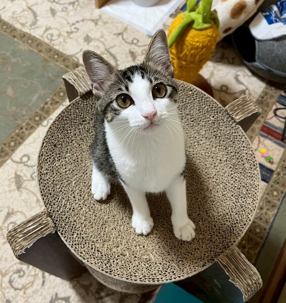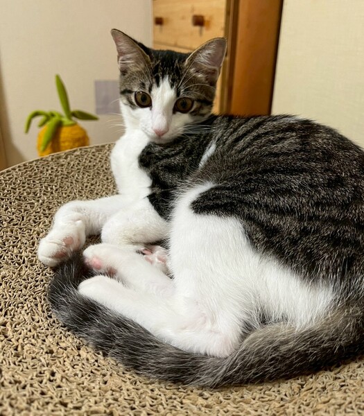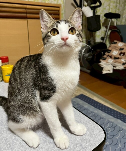 | 特徴(性格など) | 2025.4.30生まれ(推定) 毛色:キジ白 お目々くりくり、ピンクのお鼻の可愛いキジ白女の子。 背中の白い立髪がカッコいいです。 お腹が空いたり、して欲しい事があると、悲鳴のような高い声で呼びつけます笑 遊びはなんでも好きですが、特にネズミおもちゃサッカーが大好きです♪ 疲れると1人静かにベッドやケージの上で寝ています。 可愛い顔して寝相は凄いです!! 人が座ると、足の上に両足を乗せ甘えてきます♡ |