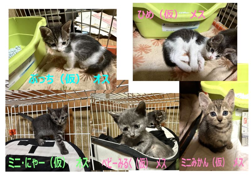 | 特徴(性格など) | サバトラちゃんはオスのぶっち君が背中に牛の様な斑模様があり、性格はやや大人しめ。メスのひめちゃんは文字通りお姫様。元気いっぱいって感じの子です。ミニみるくちゃんはマイペースな子。ミニみかんちゃんが一番元気で活発な女の子です。ミニにゃーくんは少し前に里親さんが決まりました。 | ||