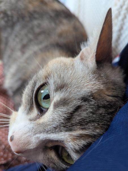 | 特徴(性格など) | パステル猫?みたいで、グレーの毛色にところどころミケが混ざっています。甘えん坊で人懐っこく、ノノと呼ぶと駆け足で寄ってきます。元々母のお店の看板猫だったので誰にでもすぐに懐き撫でさせてもらえます。膝によく乗ってくるので動けないのを覚悟してください。トイレが猫砂が苦手らしくペットシートだとしてくれます。 | ||