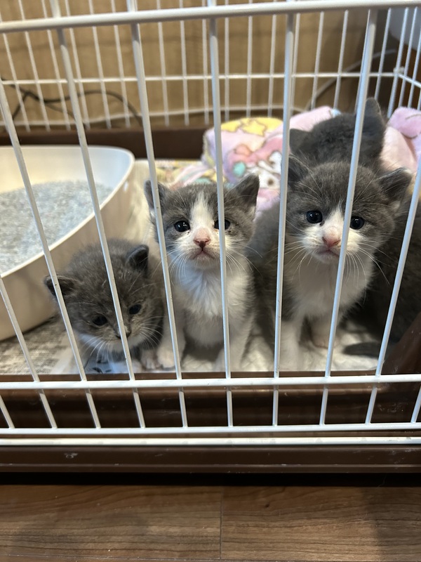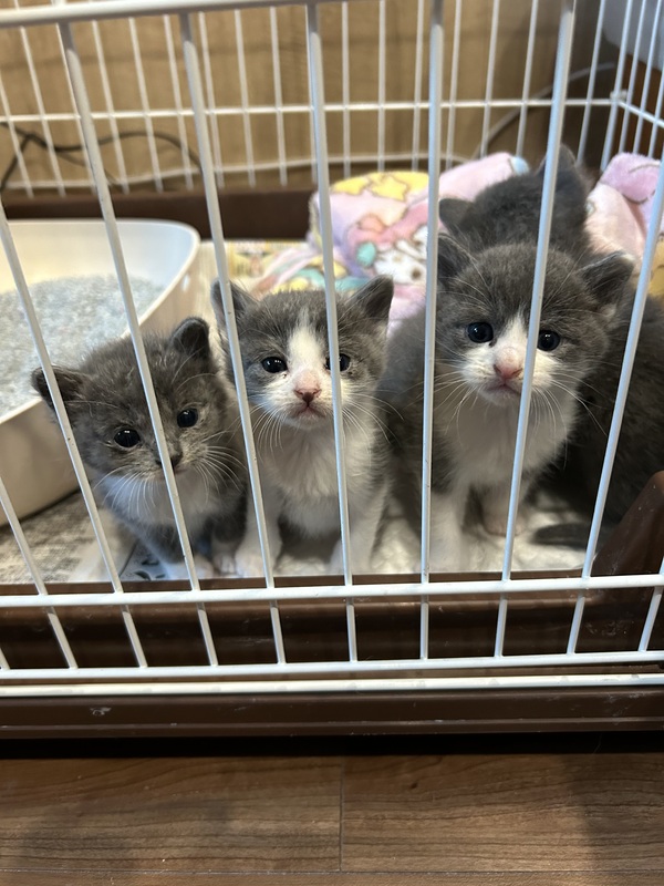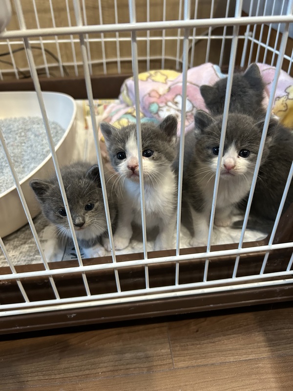 | 特徴(性格など) | グレー、グレーと白の男の子2匹 同じく女の子2匹 その内、鍵しっぽ2匹 とても甘えっ子の4匹です |