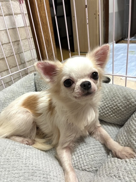 | 特徴(性格など) | 名前(仮): リンミ 性別: メス 犬種: ロングコートチワワ 毛色:ホワイト&クリーム 年齢: 2022年10月28日 体重: 2.3kg 保護経緯:チワワ専門ブリーダーからの保護 性格:人は好きで甘えん坊ですが、とても臆病な性格です。近くに寄ってきますが捕まえようとすると逃げてしまいます。 抱っこも怖いようです。他犬とは相性次第です。 トイレ: シート認識65% トレーニング中。食糞あり。 散歩: 歩けますがまだ右往左往するのでトレーニング中。 日常の様子:ゲージでお留守番しています。帰ってくると喜んで迎えてくれます。 オモチャや他犬と楽しそうに遊んでいます。 お手入れ:毎日のブラッシング・歯磨き・耳掃除・涙やけケア・定期的なシャンプー・爪切り・肛門絞り・パット処理・トリミングなど ※サマーカットのように被毛を短く切ることはしないでください。 フード: フィッシュ4 保護日: 2025年10月30日 健康状態 フィラリア:陰性 ワクチン:5種混合ワクチン接種済み マイクロチップ:装着済み 避妊・去勢:済み その他:触診・聴診・血液検査・検便、異常なし、駆虫薬投与・ノミダニ駆除済み・スケーリング済み 。 特記所見★皮膚疾患があるので、クロルヘキシジンで消毒と保湿ローションで保湿しています。週に1回程度シャンプーケアが必要です。 とても臆病ですが遊ぶのが好きなので、1匹飼いではなく先住犬がいる方が良いと思われます。 |
