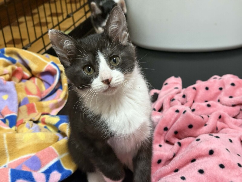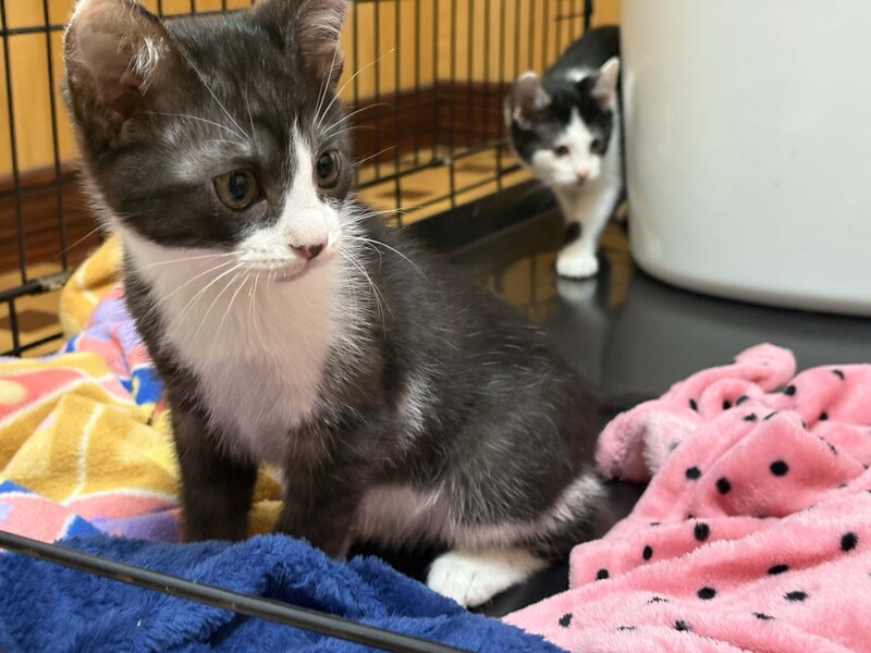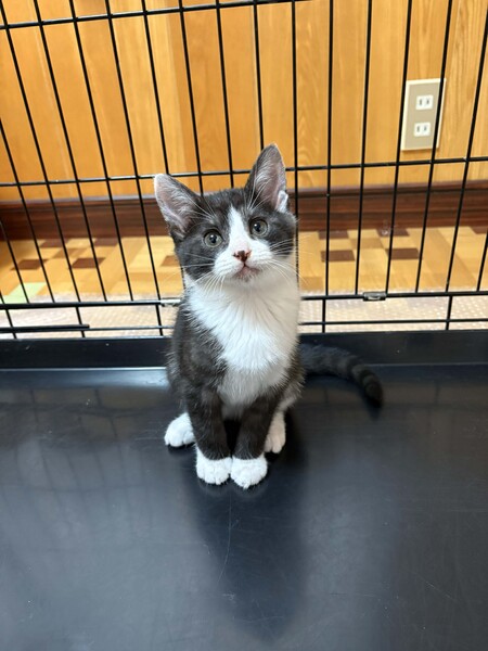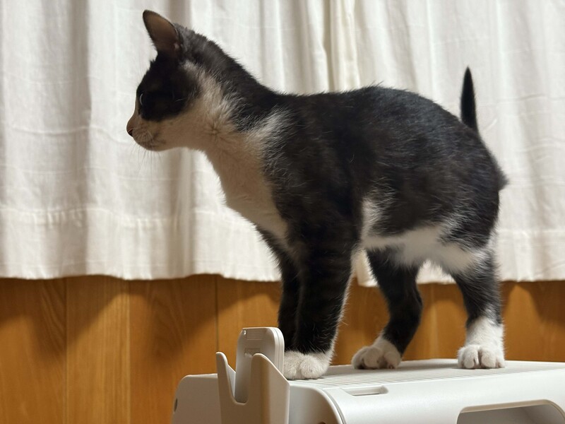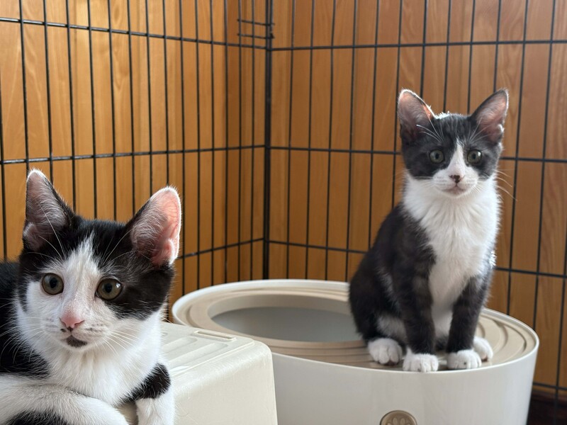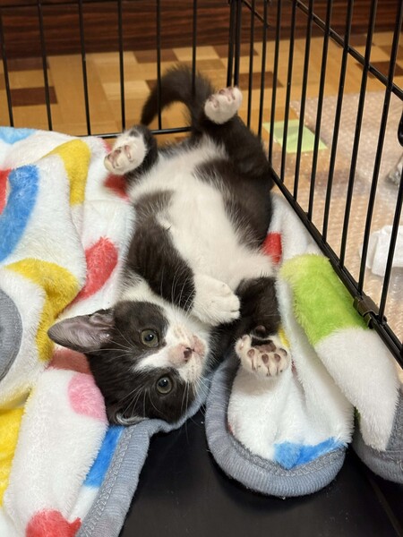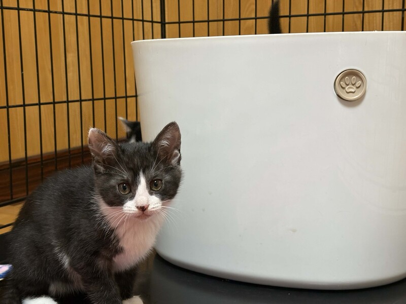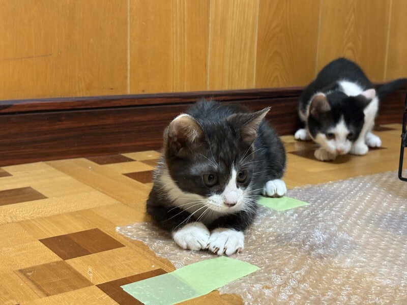 | 特徴(性格など) | 黒白のハチワレのオス猫です。 黒毛の色素が少し薄く、黒毛部分がうっすらとトラ模様です。親しみやすく憎めないかわいらしさのある顔立ちです。 元気に暴れる時もありますが、比較的おとなしめで穏やかな感じです。 25年9月末頃の誕生、生後3ヶ月ほど、体重1500gほど 11月末まで野良の母猫のお乳を飲み安全な屋外で見守りました。 11月末に各種検査後に室内飼育に移行しました。現在、ドライフードを食べています。 検査では、幸い病気の疑いはありません。 元気に走りまわって元気いっぱいで健康な様子です。 ●レボリューション(フィラリア予防、ノミ、猫回虫、耳ダニの駆除薬)11月 投与 ●FeLV(猫白血病ウイルス)11月 陰性 ●FIV(猫免疫不全ウイルス)11月 陰性 ●フェロセルCVR(猫用3種感染症予防ワクチン)12月 接種(1回目) |
