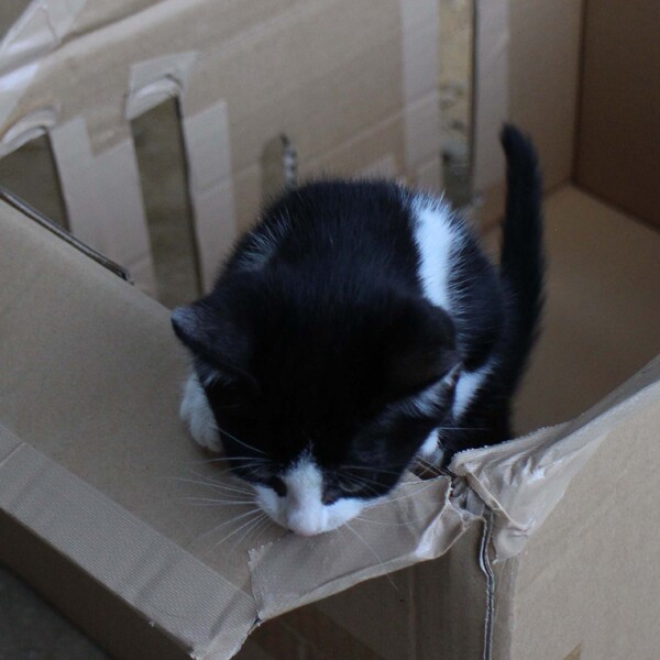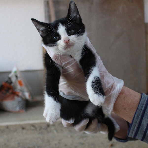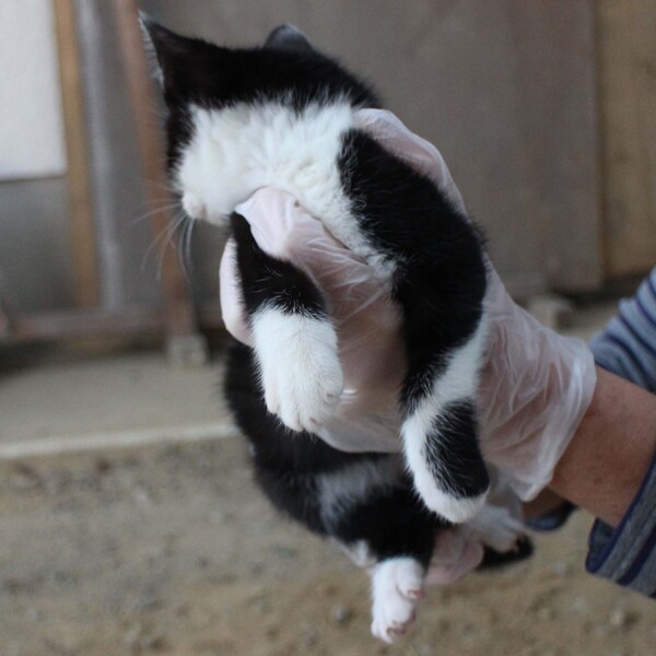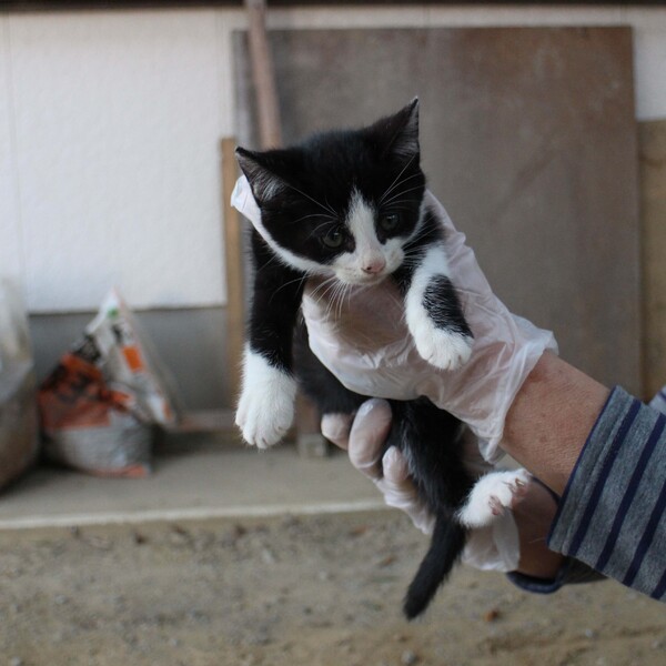 | 特徴(性格など) | 黒白のハチワレのメス猫です。 おでこの白毛が狭く、白毛が剣先の様な模様のくっきりとした端整な顔立ちです。 元気に暴れる時もありますが、比較的おとなしめで穏やかな感じです。 現在、生後1ヶ月半ほど、体重700~800gほどです。母猫の母乳を飲む時もありますが主食は離乳食に移行しつつあります。健康体で元気な様子です。 |