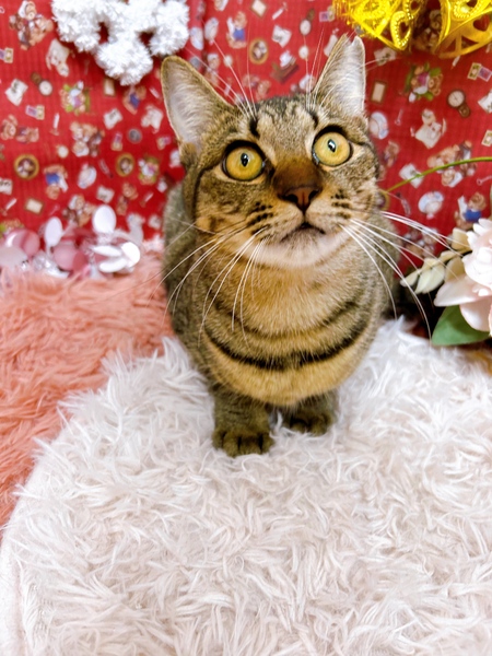 | 特徴(性格など) | おっとりさんな性格で、慣れてくると、すりすりゴロゴロしてきます。 ふっくらした体型で、触り心地、最高です。 触られるのも抱っこも大丈夫です。 おもちゃ遊びより、走り回って遊ぶのが好きです。 よく食べ、綺麗なウンチをしてます。 |