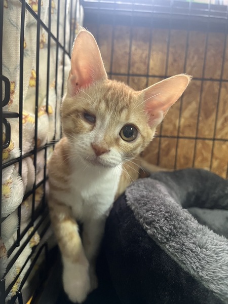 | 特徴(性格など) | 猫風邪の後遺症で右目は見えませんが、とても元気な茶白の女の子です。 よく慣れていて、よくゴロゴロと大きめに言います。 爪切りも平気です。 尻尾がピンと長いです。 血液検査:エイズ(−)、白血病(−) |