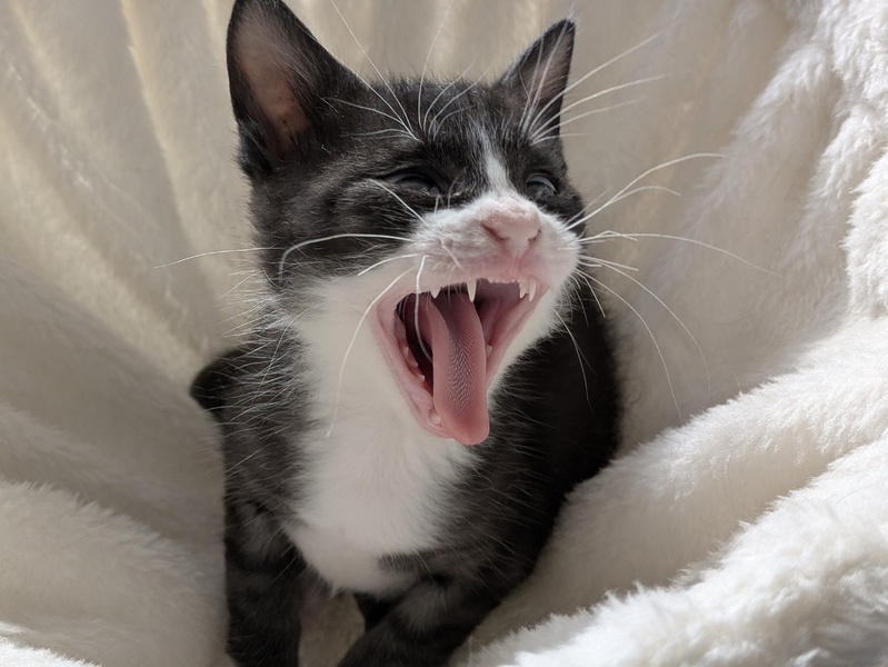 | 特徴(性格など) | 鼻先と手足の先が白いソックス猫です。片足だけ黒いソックス履いてます。全体的に真っ黒ではなく濃いグレーで薄っすら縞模様がありますが、子猫のうちだけかもしれません。大人になったら黒くなるのかも? ごはんをよく食べます。先住猫のカリカリもバリバリ食べてます。 すごく元気でやんちゃなので、嚙まれたり引っかかれたり脚をよじ登ってきたり人間の生傷が耐えません…(;^_^A |