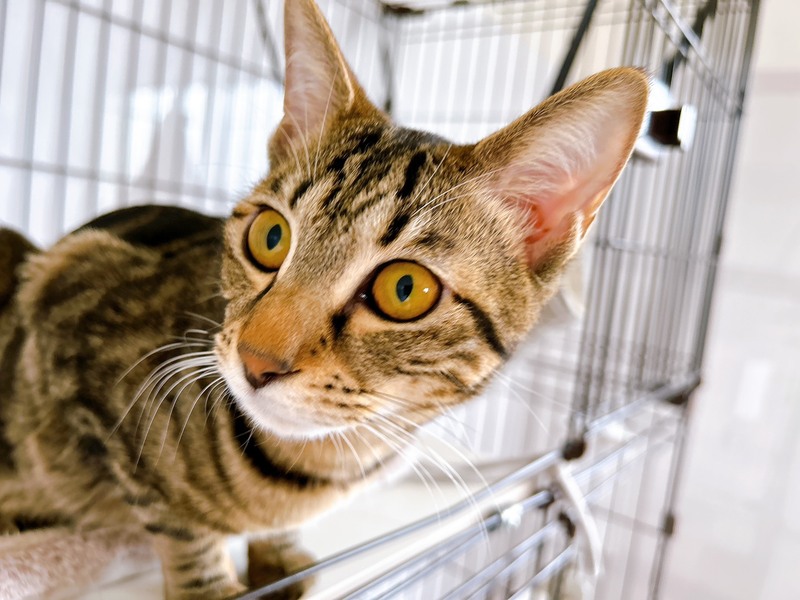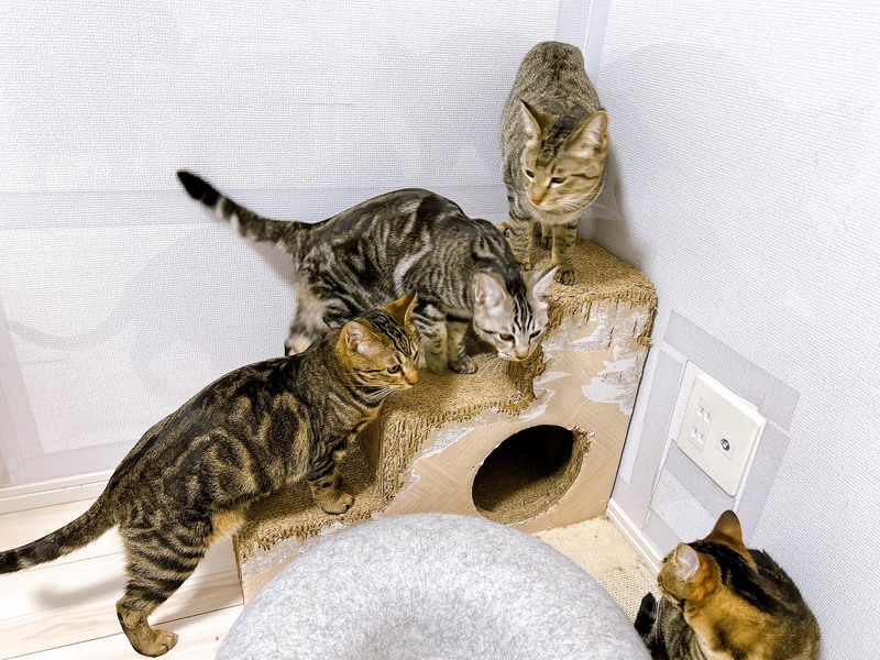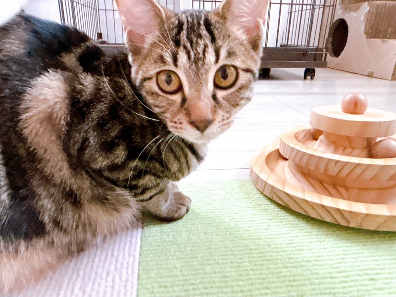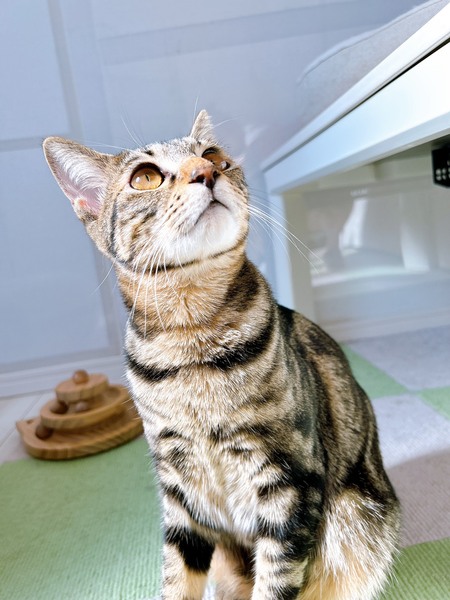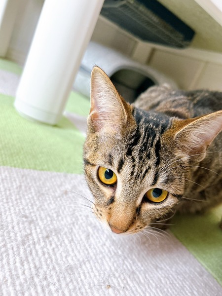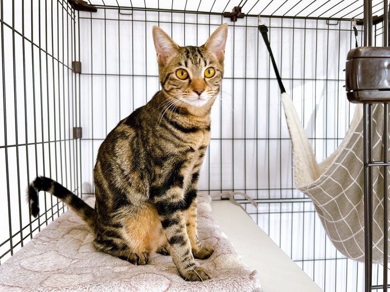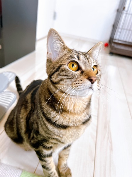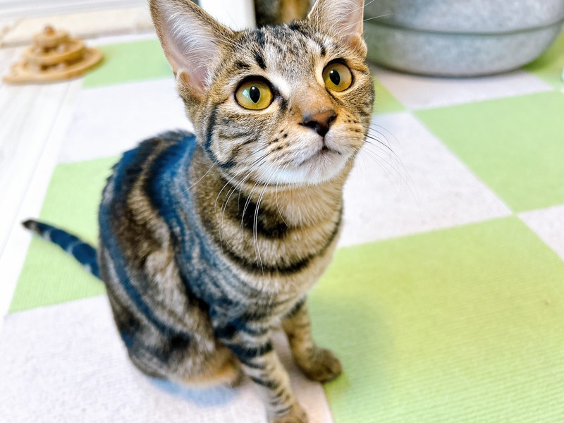 | 特徴(性格など) | 2025.7.23生まれ(推定) 毛色:キジトラ よく遊んで、よく食べるお転婆さん。 運動神経がとてもよく、ダイナミックなジャンプを披露してくれます。 周りの空気が読める子なので、他の子が甘えていると譲ったりする優しい子です。 |