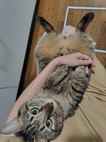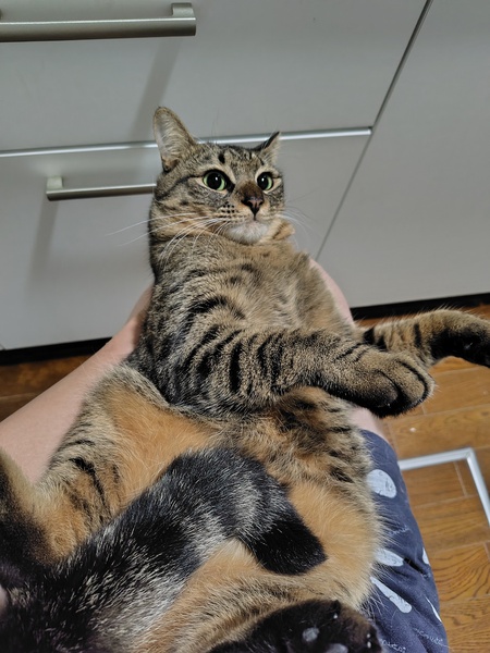 | 特徴(性格など) | キジトラ柄です。 保護当時から手が大きかったので、この子は大きくなるぞと思っていましたが、本当に大きくなりました。 性格は穏やかで大人しく、猫にも人にも甘えん坊です。 なでなでが大好きです。 抱っこはあまり好きではありませんが、大人しくさせてくれます。 遊ぶのも好きで無邪気です。 目を見ながらきゃっ!きゃっ!と鳴いて、おやつやなでなでをねだってきます。 エイズ白血病マイナスです。 |