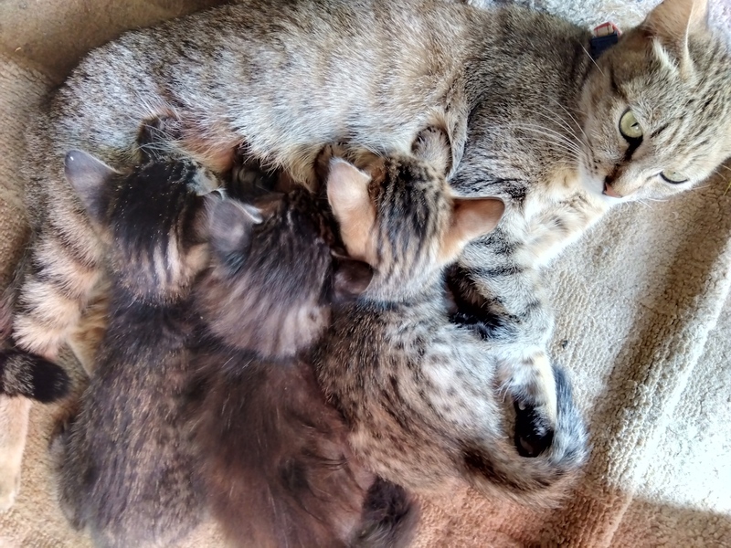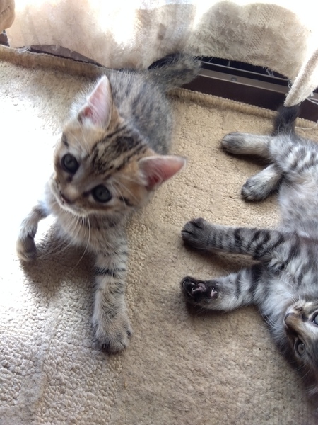| 特徴(性格など) | 【特徴】 キジもサバも元気すぎてプロレスごっこを毎日してます。 もう1か月になるんですが親のおっぱいを飲んだりカリカリを食べたりで食欲は旺盛です。 |