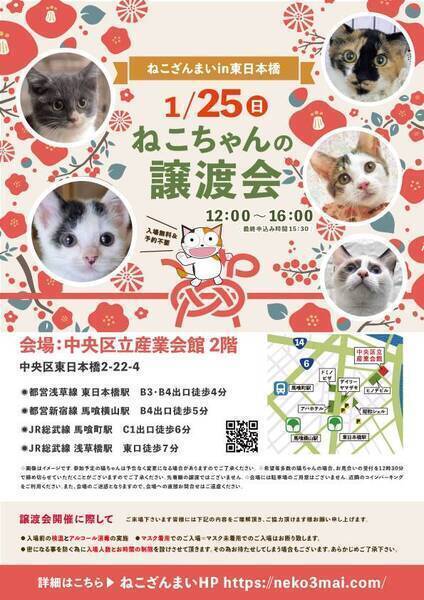 | その他(譲渡条件など) | 11:30より、2階会場入口にて受付を開始します。 受付時に入場予定時間が記入された整理券をお配り致しますので、整理券を受け取った方はお時間になりましたら2階会場入口に番号順にお並び下さい。 ※11:30より早くいらしてもお待ちいただく場所がございません。 また、近隣にお住まいの方や他階フロアのご利用者様にご迷惑となる場合がございますので、受付開始時間にあわせてお越しくださいますよう、何卒ご協力お願いいたします。 ※ねこざんまい譲渡会は、先着順で里親様を決定する譲渡会ではありません。 先に申し込みをした方を優先することもありません。 お話をして、その猫ちゃんに合ったおうちに決めさせていただいております。 12時に開場し、里親様の決定は14時以降となります。 14時以降にご入場の場合、希望の猫ちゃんが決定している可能性があります。 また1頭に対し多数のご希望をいただいた場合、早めに申し込みを締め切らせていただく場合がございますので、予めご了承下さい。 里親様決定は14時以降となります。 その後、迎え入れ準備の説明等のお時間も頂戴しますので、お時間に余裕を持ってご来場下さい。 ~~~~~~~~~~~~~~~~~~~~~~~~~~~~~~ ★仔猫ご希望の里親様★ 仔猫ちゃんたちは、まだ体がしっかりしていない赤ちゃんです。 下痢だけでも数時間対応ができなかっただけ死に至る事もあります。 その為、月齢に応じたお留守番時間を設けさせていただいております。 また、子猫ちゃん(6ヶ月未満)の里親様には子猫支援金のご協力をお願い致しております。 ★猫ちゃんとのお見合いは譲渡会で!★ ねこざんまいの猫ちゃんは譲渡会でのお見合いのみとなります。 『この子はいつ譲渡会に参加するの?』『譲渡会場の場所はどこ?』などは、ねこざんまいホームページをご覧ください。 https://neko3mai.com/ ★楽しく猫ちゃんと触れ合って★ ねこざんまい譲渡会は、猫ちゃんも里親様も保護主も笑顔で過ごせる譲渡会を目指しています。 これから20年以上、楽しい時も、悲しい時もいつも傍にいてくれる大切な家族になる猫ちゃんです。 会場には沢山の猫ちゃんがいます。 1匹1匹、触れ合って猫ちゃんとお話してください。 『初めて猫ちゃんを家族に迎える方』 『先住猫ちゃんのお友達を迎える方』など トライアルの仕方や先住猫ちゃんと仲良くなるコツなど経験豊富な保護主やスタッフにお気軽にご相談ください! 猫を愛し、そして猫に愛されている猫好きスタッフと保護主がアドバイスさせていただきます。 ★里親希望のみなさまへ★ ペットではなく、家族一員としてたっぷり愛情を注いでくださるご家庭をお待ちしております。 恐れ入りますが ●学生の方 子猫・幼猫希望の60才以上の方のみのご家庭 ●脱走防止対策にご協力いただけない方 は原則譲渡を遠慮させていただいております。 ●一人暮らし・同棲(事実婚)の方 保護主の希望や猫の年齢・性格等により、ご希望に添えない場合もございます。 参加猫ちゃんは、それぞれ保護主(実際に猫ちゃんを自宅に入れ、保護をしている方)が異なります。 詳しい条件なども異なる場合がございますので、会場内で直接保護主とお話ください。 〖共通条件〗 1.終生飼育 2.完全室内飼い 3.脱走防止対策へのご協力 4.避妊去勢手術 5.契約書類へのサイン 6.定期報告 7.医療費等の負担 当日の猫ちゃんを連れて帰ることはできません。後日、保護主が里親様のご自宅までお届け致します。 その為、移動の際の猫ちゃんの負担を月齢などから考慮し、お届け地区を限定させて頂くこともございますのでご了承ください。 ご理解とご協力のほど宜しくお願い致します。 ☆よくある質問☆ ・譲渡の条件 ・ご負担頂く費用 ・譲渡会の場所等は ホームページに詳しく掲載させて頂いておりますのでご覧ください。 https://neko3mai.com/ メールでのお問い合わせはすぐにご返答出来ない場合がございますのでご了承ください。 ホームページ https://neko3mai.com/ お問い合わせ http://www.neko3mai.com/contact/form_general.html ねこざんまいブログ http://ameblo.jp/neko3mai/ |
