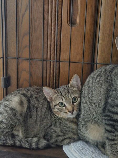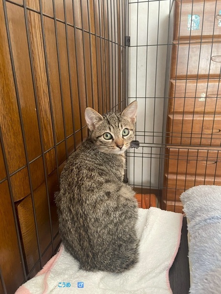 | 特徴(性格など) | 人馴れしていない親に育てられ、また少し大きくなってからの保護だったため怖がり4兄弟です。4兄弟のうち1匹はお家がきまり、もう1匹はトライアルに出発予定です。 兄弟の中では一番人馴れしていません。威嚇、攻撃はしませんが、抱っこしようとすると逃げ回ります。無理やり抱っこすると緊張してイカ耳になります。 兄弟のバナナ君と仲良しでプロレスなどして遊びますのでできれば兄弟一緒が良いですが、一匹でもかまいません。先住猫ちゃんがいるお家でも大丈夫と思います。猫飼い経験者の方でゆっくりこうめ君に合わせて慣らしていただける方希望です。 |