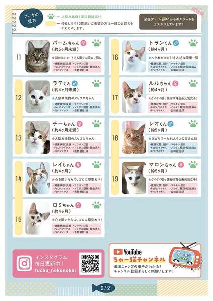 | 里親募集する理由 | 個人、自治会、商店街、市役所から依頼されTNRに入った現場でrescueした猫の内、子猫ちゃんを中心に里親様を募集しています。 ※活動内容や、里親さまからの心温まるお便りを載せているので、当会のBlogも是非ごらんください。 https://chuneko.exblog.jp/ ※Twitter、FaceBook、 Instagram、YouTube、TikTok始めました! [NPO法人 府中猫の会]で検索! |
