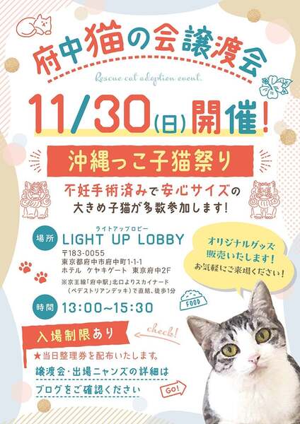 | その他(譲渡条件など) | ୨୧⌒⌒⌒⌒⌒⌒⌒⌒⌒⌒⌒⌒⌒⌒⌒୨୧ 府中駅直結⭐︎譲渡会のお知らせ ୨୧⌒⌒⌒⌒⌒⌒⌒⌒⌒⌒⌒⌒⌒⌒⌒୨୧ 【日時】11月30日(日)13時〜15時30分(受付) 【場所】LIGHT UP LOBBY (ホテル ケヤキゲート東京府中2F) ※混雑時は、整理券を配布。ご予約は必要ありません。 ※会場への直接のお問い合わせはお控えください。 ご質問は、fuchu_nekonokai@yahoo.co.jpまで 会場へのアクセスこちら☞https://youtu.be/jxn2O6sdyOk こんにちは。『NPO法人府中猫の会』です! 地元のTNR活動&保護活動(野良猫を増やさない取り組みや行き場のない猫達の保護)に尽力しているボランティア団体です。 その他にも当ボランティアの取り組みとして、地方の行き場のない猫達の保護にも力をを入れております。 今まで『熊本殺処分STOPプロジェクト』を掲げて約200匹の猫達を空輸して来ました。 そして、今現在は『沖縄プロジェクト』に着手しております。現在沖縄全土(やんばる地区や離島含む)から、たくさんの子猫達を空輸して来ております。 今回の譲渡会でご紹介する子達も沖縄っ子達が多く参加します。 みんな、どの子も行き場のない子達ばかりです。 一生の家族を求めて譲渡会に出場しますのでどうぞよろしくお願い申し上げます。 ◉子猫が多頭参加しますが、殆どの子猫が去勢or避妊手術後にお届けとなり、尚且つ家猫訓練を終えてからのお届けとなる為、お留守番はできます。お仕事をお持ちのご家庭はご相談ください。 ◉小さめの子猫は家猫訓練などパーフェクトです。お留守番時間などをご提示いただき、去勢や避妊に関しては、全面的にバックアップさせていただきますのでご安心ください。 ◉子猫ちゃんですが半日ぐらいはお留守番できるように躾けてあるのでご安心ください。(家中フリーになってもトイレ訓練は勿論の事、家猫訓練もパーフェクトです) ◉成猫さんに関しては、飼いやすさ抜群です!お仕事をフルタイムでお持ちのご家庭でも問題なく受け入れていただけます。 【 本気で猫ちゃんを飼いたい方必見! 】 譲渡会についてのシステムはこちら https://ameblo.jp/team-rose-cats/entry-12894250807.html 【 よくあるご質問 】 ◆猫を飼いたい。でも保護猫ってハードルが高い気がする… その点はご安心ください。出場する全ての猫達はみんな家猫訓練を受けており、トイレ訓練もパーフェクトな猫達です。 猫飼い初心者OKな猫ちゃんも多数出場します。 ◆60歳を超えているが、猫を迎えたい。 今時の60代様、70代様は、大変お若くアグレッシブでいらっしゃいます! そんな方々にはぜひ成猫さんをオススメさせていただきます。 今回出場する成猫さんは、捨てられた子達ばかりです。(多頭崩壊、飼育放棄、夜逃げによる強制執行) みんな心に傷を負っている子達を保護しております。しばらく心のケアや家猫訓練をバスした子達を出場させますので、ぜひ!会いに来てください。 ※60歳以上の方は後継人をお願いしております。後継人の方とご来場いただくと私達も選考しやすいのでよろしくお願いします。 ◆わが子の為にも保護猫を迎えたい!しかし、私達家族一同、猫を飼うのは初めてです。どうしたらいいですか? そのようなご家庭こそぜひ!お待ちしております! 猫ちゃんの魅力を知っていただきたいのと、お子様が保護猫達と一緒に育つ事により『命に優しい情操教育』となると願っている当会です。 喜んでお待ちしております。 ※猫アレルギー問題があります。初めて猫を飼う方は猫アレルギー検査を事前にしていただくと私達も選考しやすいです。 特にお子様には必ず検査をお願いします。 ◆仕事があって、お留守番をさせるのが心配… ご心配はご無用です! 今回出場する子達はみんな成猫さんなので、一日フルタイムでお仕事をお持ちのご家庭でも問題なく迎えていただける子達ばかりです。 【 譲渡会にご参加くださる方々へ 】 ₍ᐞ•༝•ᐞ₎◞ ̑̑ ◎混雑を防ぐ為、入場制限をさせていただきますが、ご予約の必要はございません。 入り口カウンターにてスタッフが整理券を配布いたしますのでご協力お願い申し上げます。 ₍ᐞ•༝•ᐞ₎◞ ̑̑ ◎初めて猫ちゃんを迎える方(特にお子様のいるご家庭)は、猫アレルギーの有無を明確にしてくださると選考しやすいです。 ₍ᐞ•༝•ᐞ₎◞ ̑̑ ◎譲渡会はお見合いのみの場となっております。 ご来場前に必ず下記の事項をご参照ください。 ▶︎譲渡会のシステムについて◀︎ https://chuneko.exblog.jp/32604872/ 【見学希望やご支援者の方々へ】 ₍ᐞ•༝•ᐞ₎◞ ̑̑ いつもありがとうございます♡ 会場には、カフェもございます。 お飲み物をご注文くださればお席にご案内いたします。(入口スタッフに一言お申し出ください。) 大変申し訳ないのですが、里親希望の方々を優先的にご案内させていただくのをご了承の上、お越し下されば幸いです。 会場では、ちゅー猫オリジナルグッズも販売しております。 普段、ネットで販売している公式グッズの現物をお手に