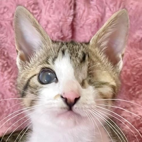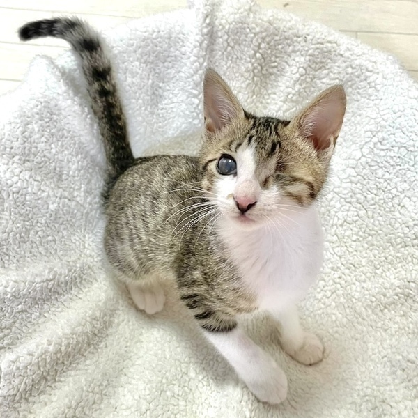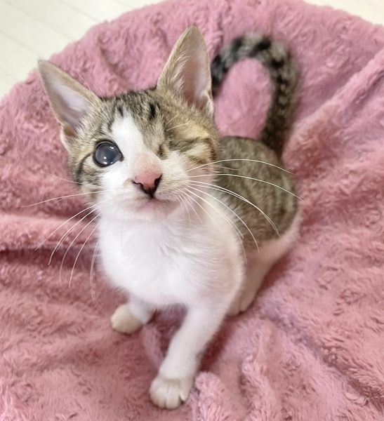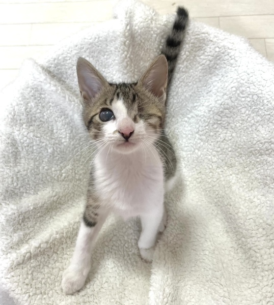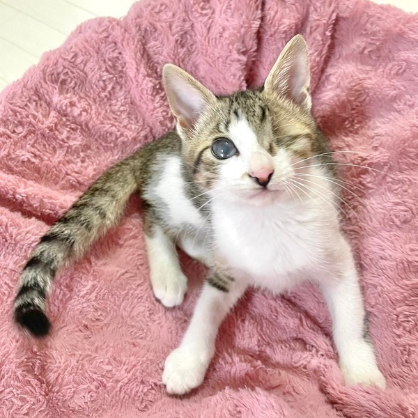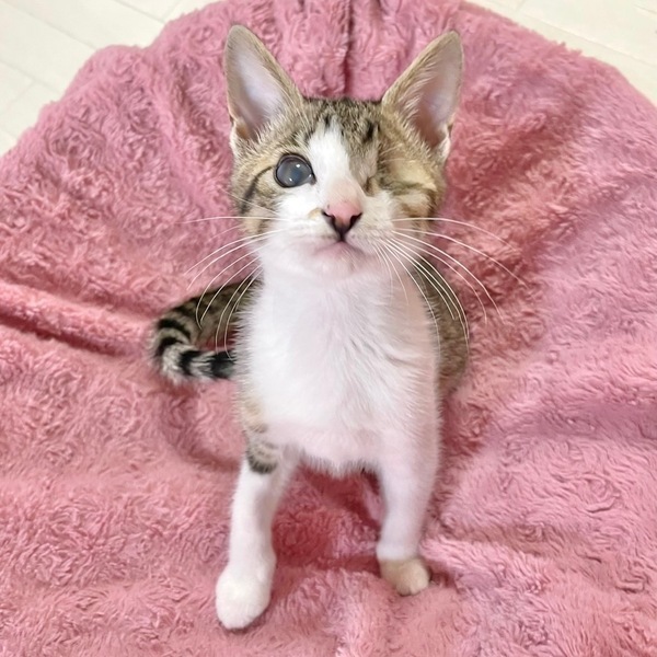 | 特徴(性格など) | 【仮名】希望ちゃん 【性格】ベタ馴れにゃんこの希望ちゃん☆ 片眼にゃんこですが日常に支障はなく 歩くたびに足にまとわりつく甘えん坊で 抱っこも大好きなカワイコちゃんです。 元気いっばいに遊び、猫じゃらしの音で走って来たり、 ボール遊びが大好きでボールと戦います! 同世代ペアや大人猫も全然平気でくっついて寝たりしているので、 先住ちゃんの居るお家でも大丈夫だと思います♪ 一緒に過ごしているお友達や兄妹とのお迎えをお願い致します。 ※1ピキ譲渡不可 |