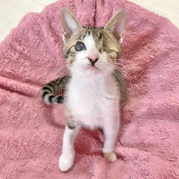 | 特徴(性格など) | 【仮名】希望ちゃん 【性格】ベタ馴れにゃんこの希望ちゃん☆ 片眼にゃんこですが日常に支障はなく歩くたびに足にまとわりつく甘えん坊で抱っこも大好きなカワイコちゃんです。 元気いっばいに遊び、猫じゃらしの音で走って来たり、ボール遊びが大好きでボールと戦います! 同世代ペアや大人猫も全然平気でくっついて寝たりしているので、先住ちゃんの居るお家でも大丈夫だと思います♪ 一緒に過ごしているお友達や兄妹とのお迎えをお願い致します。 ※1ピキ譲渡不可 |