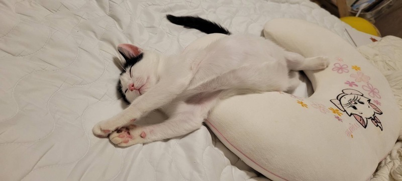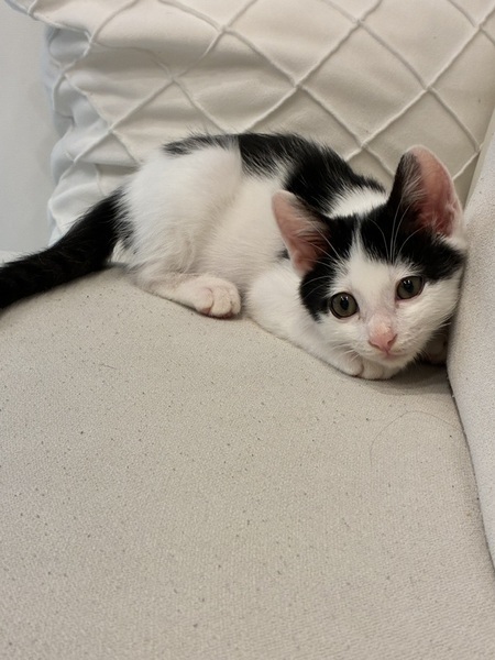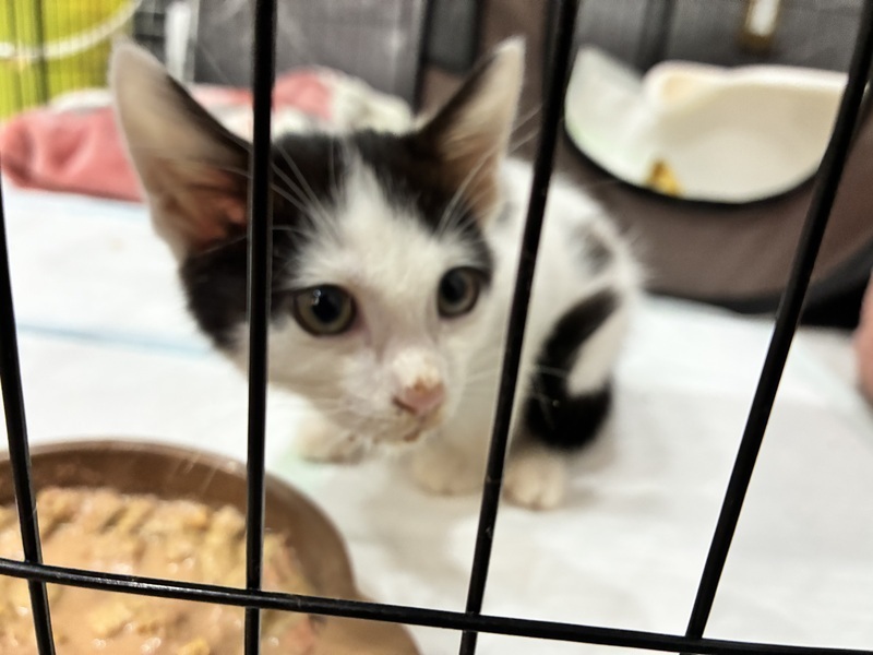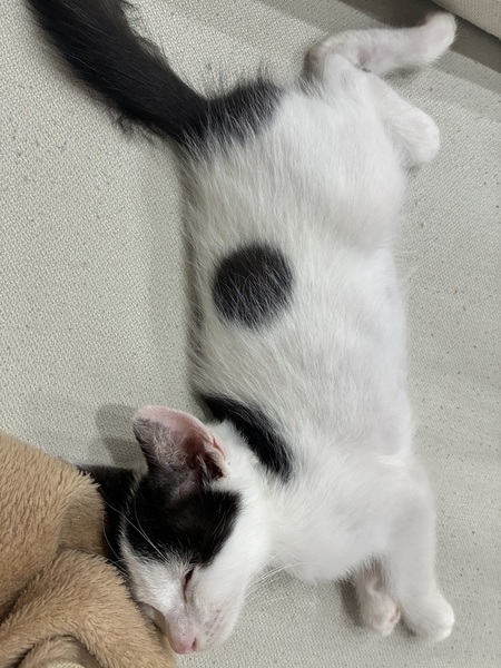 | 特徴(性格など) | 推定4ヶ月ほどの白黒ハチワレの子猫です。 遊び盛りの甘えん坊です。 お腹に綺麗な丸模様があります。 10月18日に保護した際に動物病院では約2ヶ月くらいの子猫と言われました。 猫エイズ、白血病は陰性です。 トイレは完璧にできます✨ |