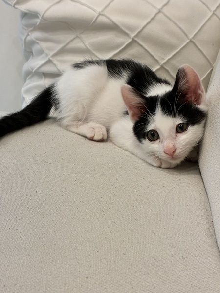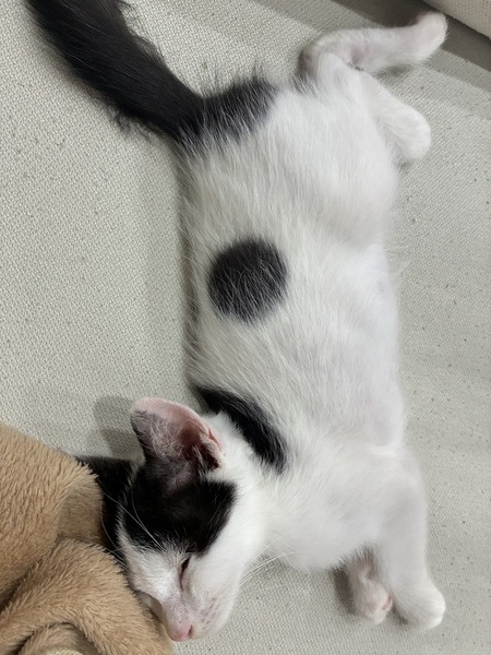 | 特徴(性格など) | 推定4ヶ月ほどの白黒ハチワレの子猫です。 遊び盛りの甘えん坊です。 お腹に綺麗な丸模様があります。 10月18日に保護した際に動物病院では約2ヶ月くらいの子猫と言われました。 |