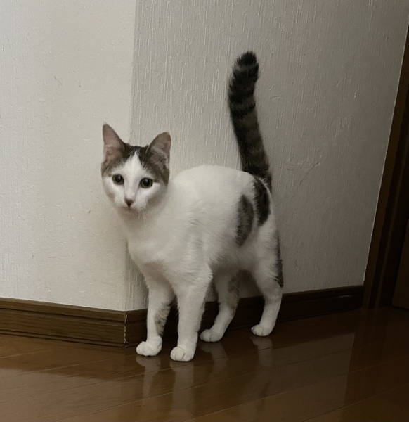 | 特徴(性格など) | 白キジ 片足にキジ柄があります。 ゴロゴロ甘えっ子です。 エイズ・白血病、共に陰性です。 |