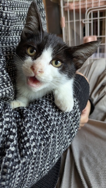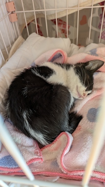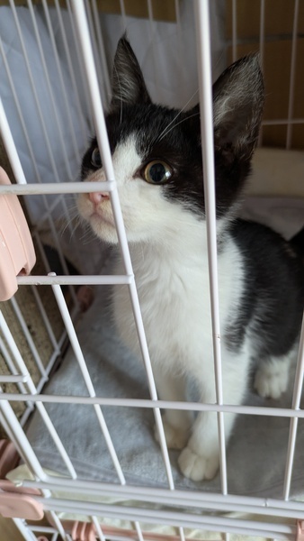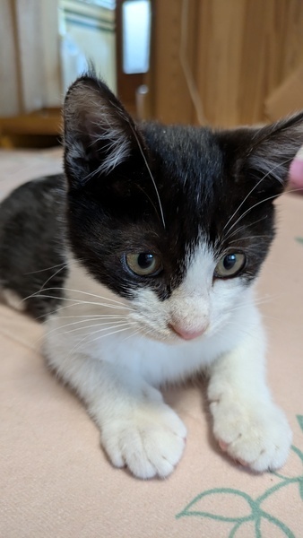 | 特徴(性格など) | 約3ヶ月の黒白のハチワレ子猫です。 甘えん坊で、遊ぶことが大好きです。人慣れも十分で、子猫らしく好奇心旺盛で無邪気です。 トイレもすぐに覚えました。 |