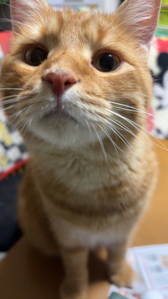 | 特徴(性格など) | 短毛の茶トラです 食いしん坊で大きいです 人間大好きで甘えん坊で皆んなにくっ付いて歩きます ストーカーの様にまとわりつき 立って前脚ですがりつき 構ってと良く喋り ワンコの様にペロペロして来ます 若くて元気でボールや猫じゃらしの取って来い遊びが大好きです 小学生のお子さんが居る様な若い家族に向いた性格です | ||