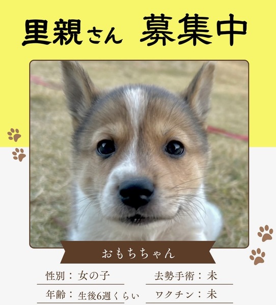 | 特徴(性格など) | 特徴(性格など) 【愛称】おもちちゃん 【犬種】ミックス 【性別】メス 【年齢】生後6週くらい(2025/12/01現在) 【毛色】白茶 【日記】 インスタ https://www.instagram.com/delacroix_d1?igsh=a2t2YXVyaG41cmJ1 https://www.instagram.com/zeroiba_boshu/ 【性格・その他】 可愛い子犬との生活は、穏やかで楽しくてとても幸せなものですが、パワフルな子犬をお世話する中には大変なこともたくさんあります。 以下をよくお読みいただき、覚悟を持ってお迎えくださるご家族様からのご応募をお待ちしています。 【食事】 1日3回 朝晩ドライフードを食べています 【排泄】 トレーニング中(基本的に散歩中でも普通に出来ます)が、新しい環境では一からのトイレトレーニングが必要になります。トイレのタイミングを見計らって誘導する、成功したらその場でごほうびをあげる、失敗したらすぐに片付ける等、トイレが定着するまでは、目を離さず、叱らず、根気強く、おおらかな気持ちでトレーニングをお願いします。 【生活】 朝から晩まで、1時間たっぷり遊んで2時間寝る、の繰り返しです。子犬は一人では遊べませんので、十分なお散歩・引っ張りっこなどの相手になり、十分に満足し、疲れて眠たくなるまで一緒に遊んであげることが必要になります。 環境が変わり夜泣きをする場合もあります。 【散歩】 譲渡時もお散歩練習の継続をお願いします。 将来的には朝晩最低でも1時間以上のお散歩が必要になります。 散歩時の逸走は命にかかわりますので、ダブルリードの使用をお願いしています。 また、GPSなどの位置情報ツールの着用もお願いします。 【室内の環境設定について】 ケージを使用しない室内フリー飼育をお願いしています。ご家族様と同じスペースで家族の一員として生活できるようにお願いします。 好奇心がいっぱいの子犬ですので、いろいろな物に興味を持ち、なんでも口にしようとします。誤飲誤食には細心の注意と対策が必要です。 すぐに大きくなり運動能力も高く力も強くなりますので、大切な命を守るため、脱走防止の扉や柵の設置などは万全の対策をお願いしております。 子犬は見守るだけでは育ちません。お世話は全て子犬のペース、その都度の対応が必要になります。 ご家族様の生活の中に、子犬にかけられる時間的、経済的、精神的余裕が十分にあるか、よくよくお考えいただきたいと思います。 十数年後には介護が必要になるときがくるかもしれません。当然医療費もかかります。体重20キロの老犬を介護する体力と気力に自信はありますか?覚悟はありますか・・・? まだ始まったばかりの真っさらな犬生。消えてしまったかもしれない小さな命です。 子犬との暮らしの喜びはもちろんのこと、大変さも十分ご理解いただき、その大変さをも一緒に楽しんでくださるようなご家族様に、最後のバトンを託せることを願っています。 これから一緒にたくさん学び、たくさん遊び、生涯大切な家族として守り、惜しみなく愛情を注いで下さる優しいご家族様からのご応募を、心よりお待ちしております。 |