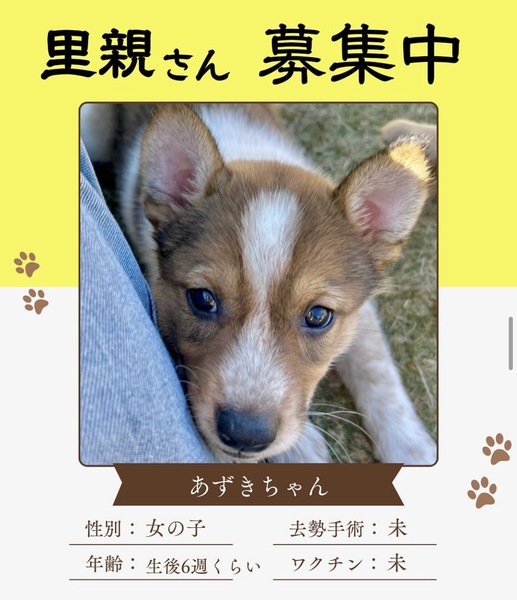 | 特徴(性格など) | 特徴(性格など) 【愛称】あずきちゃん 【犬種】ミックス 【性別】メス 【年齢】生後6週くらい(2025/12/01現在) 【毛色】白茶 【日記】 インスタ https://www.instagram.com/delacroix_d1?igsh=a2t2YXVyaG41cmJ1 https://www.instagram.com/zeroiba_boshu/ 【性格・その他】 可愛い子犬との生活は、穏やかで楽しくてとても幸せなものですが、パワフルな子犬をお世話する中には大変なこともたくさんあります。 以下をよくお読みいただき、覚悟を持ってお迎えくださるご家族様からのご応募をお待ちしています。 【食事】 1日3回 朝晩ドライフードを食べています 【排泄】 トレーニング中(基本的に散歩中でも普通に出来ます)が、新しい環境では一からのトイレトレーニングが必要になります。トイレのタイミングを見計らって誘導する、成功したらその場でごほうびをあげる、失敗したらすぐに片付ける等、トイレが定着するまでは、目を離さず、叱らず、根気強く、おおらかな気持ちでトレーニングをお願いします。 【生活】 朝から晩まで、1時間たっぷり遊んで2時間寝る、の繰り返しです。子犬は一人では遊べませんので、十分なお散歩・引っ張りっこなどの相手になり、十分に満足し、疲れて眠たくなるまで一緒に遊んであげることが必要になります。 環境が変わり夜泣きをする場合もあります。 【散歩】 譲渡時もお散歩練習の継続をお願いします。 将来的には朝晩最低でも1時間以上のお散歩が必要になります。 散歩時の逸走は命にかかわりますので、ダブルリードの使用をお願いしています。 また、GPSなどの位置情報ツールの着用もお願いします。 【室内の環境設定について】 ケージを使用しない室内フリー飼育をお願いしています。ご家族様と同じスペースで家族の一員として生活できるようにお願いします。 好奇心がいっぱいの子犬ですので、いろいろな物に興味を持ち、なんでも口にしようとします。誤飲誤食には細心の注意と対策が必要です。 すぐに大きくなり運動能力も高く力も強くなりますので、大切な命を守るため、脱走防止の扉や柵の設置などは万全の対策をお願いしております。 子犬は見守るだけでは育ちません。お世話は全て子犬のペース、その都度の対応が必要になります。 ご家族様の生活の中に、子犬にかけられる時間的、経済的、精神的余裕が十分にあるか、よくよくお考えいただきたいと思います。 十数年後には介護が必要になるときがくるかもしれません。当然医療費もかかります。体重20キロの老犬を介護する体力と気力に自信はありますか?覚悟はありますか・・・? まだ始まったばかりの真っさらな犬生。消えてしまったかもしれない小さな命です。 子犬との暮らしの喜びはもちろんのこと、大変さも十分ご理解いただき、その大変さをも一緒に楽しんでくださるようなご家族様に、最後のバトンを託せることを願っています。 これから一緒にたくさん学び、たくさん遊び、生涯大切な家族として守り、惜しみなく愛情を注いで下さる優しいご家族様からのご応募を、心よりお待ちしております。 |