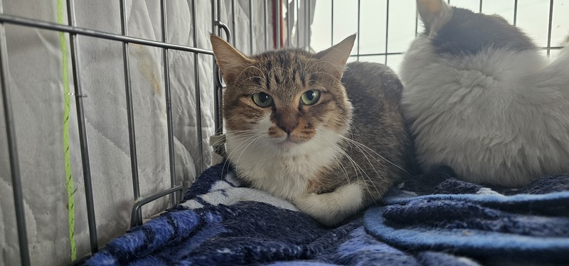 | 特徴(性格など) | キジトラ、茶白、麦わらなどいろいろ混ざった綺麗な猫ちゃんです。小柄で2.9キロです。痩せ型でしたが、保護してからふっくらしました。体重も少し増えてると思います。 人馴れがまだしておらず、パンチが出ます。毎日たくさん撫でておやつをあげて訓練中です。パートナーの白黒のオスといつも一緒です。べったりです。 |