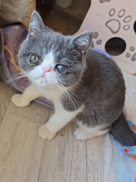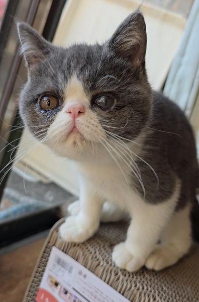 | 特徴(性格など) | エキゾチックショートヘアの子猫になります。 ブルーホワイトの綺麗なハチワレさん♪とても懐っこく可愛いです。 |