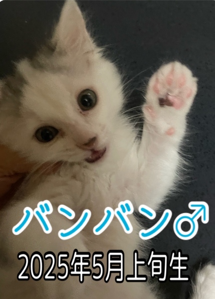 | 特徴(性格など) | 白中毛 バン柄 人懐っこくすぐ慣れます。甘えっ子 エイズ・白血病、共に陰性 |