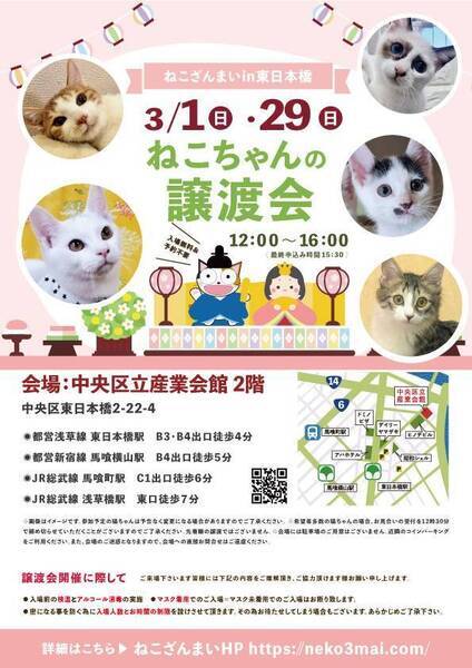 | その他(譲渡条件など) | 11:30より、2階会場入口にて受付を開始します。 受付時に入場予定時間が記入された整理券をお配り致しますので、整理券を受け取った方はお時間になりましたら2階会場入口に番号順にお並び下さい。 ※11:30より早くいらしてもお待ちいただく場所がございません。 また、近隣にお住まいの方や他階フロアのご利用者様にご迷惑となる場合がございますので、受付開始時間にあわせてお越しくださいますよう、何卒ご協力お願いいたします。 ※ねこざんまい譲渡会は、先着順で里親様を決定する譲渡会ではありません。 先に申し込みをした方を優先することもありません。 お話をして、その猫ちゃんに合ったおうちに決めさせていただいております。 12時に開場し、里親様の決定は14時以降となります。 14時以降にご入場の場合、希望の猫ちゃんが決定している可能性があります。 また1頭に対し多数のご希望をいただいた場合、早めに申し込みを締め切らせていただく場合がございますので、予めご了承下さい。 里親様決定は14時以降となります。 その後、迎え入れ準備の説明等のお時間も頂戴しますので、お時間に余裕を持ってご来場下さい。 ~~~~~~~~~~~~~~~~~~~~~~~~~~~~~~ ★仔猫ご希望の里親様★ 仔猫ちゃんたちは、まだ体がしっかりしていない赤ちゃんです。 下痢だけでも数時間対応ができなかっただけ死に至る事もあります。 その為、月齢に応じたお留守番時間を設けさせていただいております。 また、子猫ちゃん(6ヶ月未満)の里親様には子猫支援金のご協力をお願い致しております。 ★猫ちゃんとのお見合いは譲渡会で!★ ねこざんまいの猫ちゃんは譲渡会でのお見合いのみとなります。 『この子はいつ譲渡会に参加するの?』『譲渡会場の場所はどこ?』などは、ねこざんまいホームページをご覧ください。 https://neko3mai.com/ ★楽しく猫ちゃんと触れ合って★ ねこざんまい譲渡会は、猫ちゃんも里親様も保護主も笑顔で過ごせる譲渡会を目指しています。 これから20年以上、楽しい時も、悲しい時もいつも傍にいてくれる大切な家族になる猫ちゃんです。 会場には沢山の猫ちゃんがいます。 1匹1匹、触れ合って猫ちゃんとお話してください。 『初めて猫ちゃんを家族に迎える方』 『先住猫ちゃんのお友達を迎える方』など トライアルの仕方や先住猫ちゃんと仲良くなるコツなど経験豊富な保護主やスタッフにお気軽にご相談ください! 猫を愛し、そして猫に愛されている猫好きスタッフと保護主がアドバイスさせていただきます。 ★里親希望のみなさまへ★ ペットではなく、家族一員としてたっぷり愛情を注いでくださるご家庭をお待ちしております。 恐れ入りますが ●学生の方 子猫・幼猫希望の60才以上の方のみのご家庭 ●脱走防止対策にご協力いただけない方 は原則譲渡を遠慮させていただいております。 ●一人暮らし・同棲(事実婚)の方 保護主の希望や猫の年齢・性格等により、ご希望に添えない場合もございます。 参加猫ちゃんは、それぞれ保護主(実際に猫ちゃんを自宅に入れ、保護をしている方)が異なります。 詳しい条件なども異なる場合がございますので、会場内で直接保護主とお話ください。 〖共通条件〗 1.終生飼育 2.完全室内飼い 3.脱走防止対策へのご協力 4.避妊去勢手術 5.契約書類へのサイン 6.定期報告 7.医療費等の負担 当日の猫ちゃんを連れて帰ることはできません。後日、保護主が里親様のご自宅までお届け致します。 その為、移動の際の猫ちゃんの負担を月齢などから考慮し、お届け地区を限定させて頂くこともございますのでご了承ください。 ご理解とご協力のほど宜しくお願い致します。 ☆よくある質問☆ ・譲渡の条件 ・ご負担頂く費用 ・譲渡会の場所等は ホームページに詳しく掲載させて頂いておりますのでご覧ください。 https://neko3mai.com/ メールでのお問い合わせはすぐにご返答出来ない場合がございますのでご了承ください。 ホームページ https://neko3mai.com/ お問い合わせ http://www.neko3mai.com/contact/form_general.html ねこざんまいブログ http://ameblo.jp/neko3mai/ |