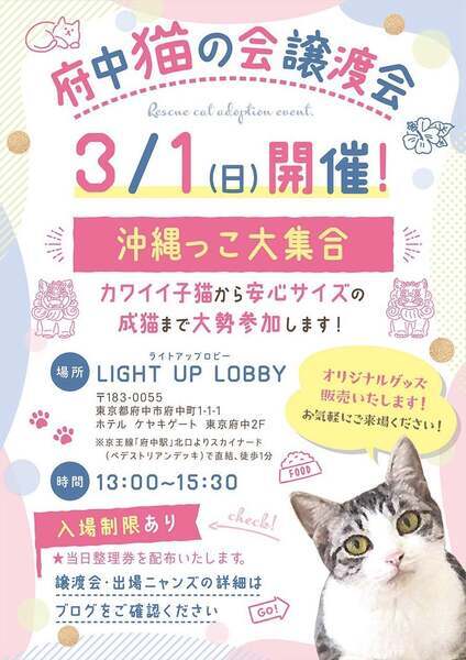 | その他(譲渡条件など) | ୨୧⌒⌒⌒⌒⌒⌒⌒⌒⌒⌒⌒⌒⌒⌒⌒୨୧ 府中駅直結⭐︎譲渡会のお知らせ ୨୧⌒⌒⌒⌒⌒⌒⌒⌒⌒⌒⌒⌒⌒⌒⌒୨୧ 【日時】3月1日(日)13時〜15時30分(受付) 【場所】LIGHT UP LOBBY (ホテル ケヤキゲート東京府中2F) ※混雑時は、整理券を配布。ご予約は必要ありません。 ※会場への直接のお問い合わせはお控えください。 ご質問は、fuchu_nekonokai@yahoo.co.jpまで 会場へのアクセスこちら☞https://youtu.be/jxn2O6sdyOk こんにちは。『NPO法人府中猫の会』です。 地元のTNR活動&保護活動(野良猫を増やさない取り組みや行き場のない猫達の保護)に尽力しているボランティア団体です。 その他にも当ボランティアの取り組みとして、地方の行き場のない猫達の保護にも力をを入れております。 今まで『熊本殺処分STOPプロジェクト』を掲げて約200匹の猫達を空輸して来ました。 そして、今現在は『沖縄プロジェクト』に着手しております。現在沖縄から殺処分となってしまう猫達を150匹以上空輸して来ました。 今回の譲渡会でお披露目する子達は、沖縄っ子達ばかりです。 成猫さんは(多頭崩壊、飼育放棄、夜逃げによる強制執行、交通事故によりセンター収容)により保護した子達です。 みんな心に傷を負っており、飼い主さんの愛に飢えている子達ばかりなので、うーんと甘えさせてください。 ‥…━━━★゜+.*・ ₍ᐞ•༝•ᐞ₎◞ 猫ちゃんを飼いたいな?迎えるならば保護猫を迎えたいな…でも保護猫ってハードルが高い気がする。 その点はご安心ください!出場する全ての猫達はある程度の家猫訓練を受けており、トイレ訓練はパーフェクトです。お迎えくださる方は、事前準備からアフターケアーまで全てさせていただきます。 ‥…━━━★゜+.*・ ₍ᐞ•༝•ᐞ₎◞ ̑̑ 子猫ちゃんを飼いたいです。パートタイムの仕事があり半日は不在となります。大丈夫ですか? 勿論です!何も生まれたての子猫を託すわけではありませんので、キチンとお留守番できるように家猫訓練をさせてから譲渡します。 この度、ご紹介させていただく子猫達は去勢or避妊手術済みの子達が参加します。安心サイズでお留守番も可能ですので、ご安心ください。 余裕があれば、子猫希望のお方は仲良し2匹組と一緒に迎える事をオススメしております! (子猫ちゃんは遊びながら成長して行きます。ある程度、ほっといて成長させたければ子猫に関しては断然!2匹飼いがオススメです) ‥…━━━★゜+.*・ ₍ᐞ•༝•ᐞ₎◞ ̑̑ 我が子の為にも保護猫を迎えたいと考えていますが、猫飼い初心者でも大丈夫?テレビなど見ているとハードルが高そうで躊躇してます。 そのようなご家庭こそぜひ!お越しください! お子様が保護猫達と一緒に育つ事により、命に優しい情操教育になると願う私達は率先してご縁を決めさせていただきます。(初心者飼いOKの猫ちゃんを選ぶのがオススメです) ※お子様の健康を守る為、猫アレルギーの有無をご確認させていただきます。(事前に猫アレルギー検査をオススメします) 初めて猫を迎えたい方も安心してご来場ください。 当会の譲渡会に出場する猫は家庭猫訓練済みであり、ご準備からアフターケアまでしっかり行うので、毎回、猫飼い初心者の方達が多数ご来場くださっております。 今回の譲渡会は子猫多数となり、家庭環境やお留守番事情など、しっかりスタッフにご相談ください。 ‥…━━━★゜+.*・ ₍ᐞ•༝•ᐞ₎◞ ̑̑ 60歳以上の里親希望者様や単身者の希望者様へ 今時の60代様、70代様は、大変お若くアグレッシブでいらっしゃいます。 そんな方々にはぜひ!成猫さんをオススメさせていただきます。 単身者の方も、後継人をご提示くだされば、是非ともゆったりとまったりと暮らして行ける子がおります。 ※60歳以上の方は後継人が必要となります。後継人の方と一緒にご来場くださると我々も選考しやすいです。 ※単身者の方も同様に後継人が必要がとなります。 【 本気で猫ちゃんを飼いたい方必見! 】 譲渡会についてのシステムはこちら https://ameblo.jp/team-rose-cats/entry-12894250807.html 【 譲渡会にご参加くださる方々へ 】 ◎混雑を防ぐ為、入場制限をさせていただきますが、ご予約の必要はございません。入り口カウンターにてスタッフが整理券を配布いたしますのでご協力お願い申し上げます。 ◎譲渡会はお見合いのみの場となっております。 ご来場前に必ず下記の事項をご参照ください。 ▶︎譲渡会のシステムについて◀︎ https://chuneko.exblog.jp/32604872/ ◎譲渡対象区域について https://ameblo.jp/team-rose-cats/entry-12927558078.html 【 ご見学者(応援くださる方々)やグッズ購入の方々へ 】 ₍ᐞ•༝•ᐞ₎◞ ̑̑ いつもありがとうございます。 お気軽にご来場お待ちしております! 大変申し訳ないのですが、里親希望の方々を優先的にご案内させていただくのをご了承の上、お越し下されば幸いです。 会場では、ちゅー猫オリジナルグッズも販売しております。 普段、ネットで販売している公式グッズの