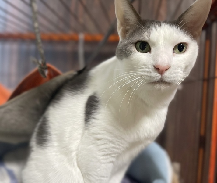 | 特徴(性格など) | 白〜グレー系の雑種の女の子です。人慣れしており、知らない人にも過度に怯える様子は少なく、ケージ越しでも「なでて!」と、近寄ってきます。落ち着いた性格で、攻撃性は聞いていません。 普段はケージ中心で管理し、毎日1〜2回室内に出して様子を見ています。 子猫だったころに捨てられていた子を引き受けてて飼育が始まっており、外の世界をほぼ知らず、とても人なれをしています。 |