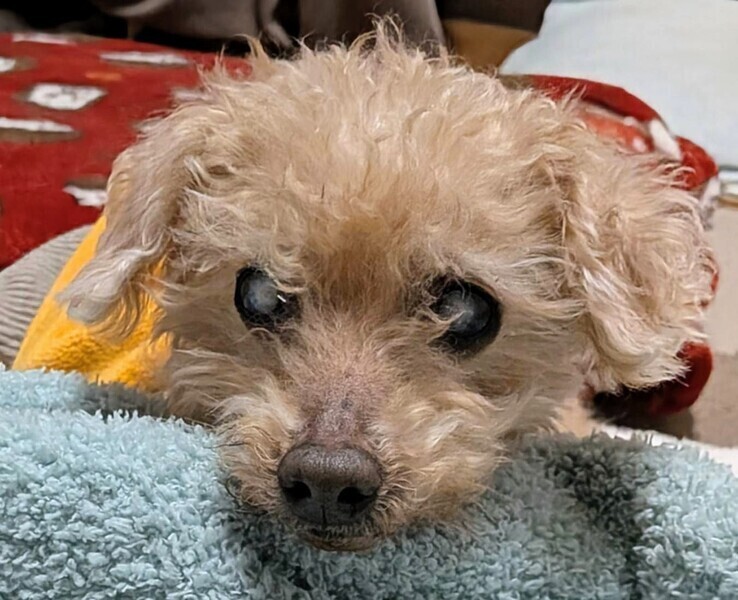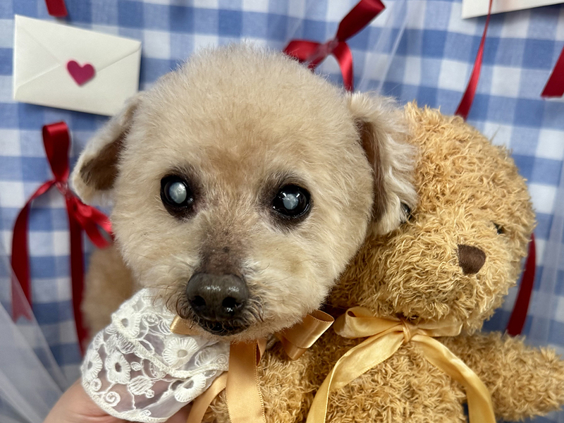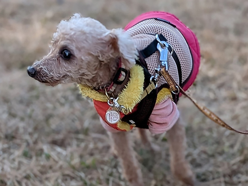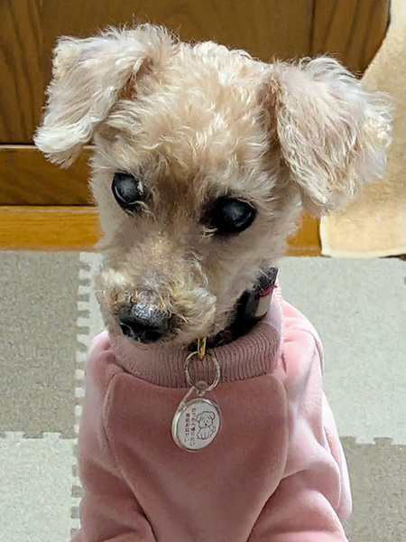 | 特徴(性格など) | ★☆性格☆★ とっても穏やかで、人間が大好きな甘えん坊です。預かりボランティアさん宅では、ボラさんの後をついて回って“ストーカー化”しているくらい(笑)。 白内障のため視力は良くないと思われますが、部屋の中ではトコトコと歩き回るなど元気に過ごしています。 人の気配を感じるとトコトコと寄ってきて、「なでて」と足元に寄り添う姿はたまらなく愛おしいです。抱っこも大好きで、腕の中で安心しきって身を委ねてくれます。 一方で、時には自分の意思をしっかり通そうとする頑固な一面も(とはいえ嫌がって噛んだりすることはないのでご安心ください)。感情表現が豊かになってきたのは、心が満たされてきた証拠だと思っています。 ★☆ごはん☆★ 保護してすぐの頃は食欲も減退気味、かつフードの選り好みもあり、食がなかなか進みませんでした。 でも、預かりボランティアさん宅で穏やかな生活を送るうちに食欲は戻り、また食の好みも把握できるようになって、今は食べることが大好き!幸太郎にとって一番の楽しみになっています。 ウェットフードの方がお好みのようですが、現在はドライフードを中心にセミモイストフードとウェットフードを併用しながら与えています。毎食「まだかな?」とソワソワしながら待つ姿は、シニアとは思えないほどの活気にあふれています。 ただし、フードは限定的です。というのも、血液検査の結果、肝臓の数値があまり良くないため、低脂肪フードだけを与えています。 ★☆散歩☆★ 日々の散歩は大好きで、スムーズに歩いて鼻をクンクンさせての“クン活”を全力で楽んでいます。 視力が弱いせいかバイクや車の音は苦手で、かつ障害物への注意も必要ですが、車通りの少ない静かな道ではしっぽを上げてぐんぐん歩いていくほど。いずれの場合でも、リードを通して優しくガイドしてあげれば安心して散歩を楽しめます。 ただし、健康状態の項目でも記していますが、両後ろ脚に不安があるため、段差を昇り降りしたりなどの負担をかけないように注意が必要です。 ★☆トイレ☆★ おしっこは室内外のどちらでも、うんちは外でします。1月に去勢手術をしてからは、室内でおしっこをする回数がかなり減りました。 トイレは、視力が弱いせいもあってか使うのが難しく、室内ではマナーベルトを着けています。 ただ、膀胱炎になったことがあるので、マナーパッドをこまめに交換したり、マナーベルトを外す時間を作ったりして、清潔に保つようにしています。 ★☆留守番☆★ 大きな分離不安はなく、お留守番は比較的上手にできます。 留守番時はサークル内で過ごしてもらっていますが、ほとんど寝ているため、静かに待っていてくれます。 ★☆他の犬との関係性☆★ お散歩中のワンちゃんにも積極的に近づいてあいさつできる社交的なコです。ボクサーくんにも、柴くんにも、チワワちゃんにも、パグちゃんにも(笑)。 預かりボランティアさん宅には同居犬はいませんが、一次保護宅ではぶんたと一緒に過ごしていました。 基本的にぶんたとは離れて過ごしていたのですが、気分で(?)寄り添って寝てみたりと、とてもマイペースに過ごしていました。 ★☆健康状態☆★ 当団体でお世話をする間に、膀胱炎や大腸炎になるなど、一過性の不調が出ることもありましたが、都度、服薬などのケアをして治療は完了しています。 また、保護時の健康診断で「脾臓に腫瘤あり」と診断されたのですが、脾臓の摘出手術は完了しており、現在は心配のない状態になっています(腫瘤も良性のものでした)。 ただそれでも、14歳という年齢もあり健康状態についての懸念点がいくつかありますので、下記をご参照ください。 ■白内障 ■クッシング症候群の疑い ■前立腺過形成 ■口腔環境が悪い ■左後ろ脚:過去に股関節骨頭切除術の痕 ■右後ろ脚:股関節脱臼 ~白内障~ 白内障のため、幸太郎は視力は良くないと思われます。 本人はそれをあまり気にすることなくずんずん歩いてしまうので、散歩時など段差や障害物が近づいたらリードをコントロールして転んだりぶつかったりするのを予防しなければなりません。 また留守番をさせる際は、段差がないスペースを用意したり目を傷つけそうな箇所をカバーしたりといった工夫が、ケガの予防のために必要です。 ~クッシング症候群の疑い~ 健康診断の結果、「肝臓に影がある」「ALPの値が高い」「副腎がやや大きい」と指摘され、また普段から多飲多尿であること、皮膚が薄いことなど、クッシング症候群の特徴が当てはまっています。 肝臓の数値が高いためウルソを服用しており、経過を観察しているところです。 ~前立腺過形成~ 保護時、未去勢だった幸太郎は、未去勢の老犬によく見られる前立腺過形成の状態でした。当時、少量のおしっこを頻繁にしていたのですが、この影響だったと考えています。 ただし、脾臓の腫瘤摘出手術と同時に去勢手術も行っており、頻尿などの症状も徐