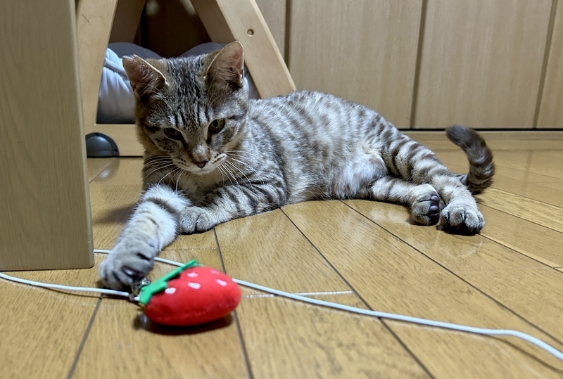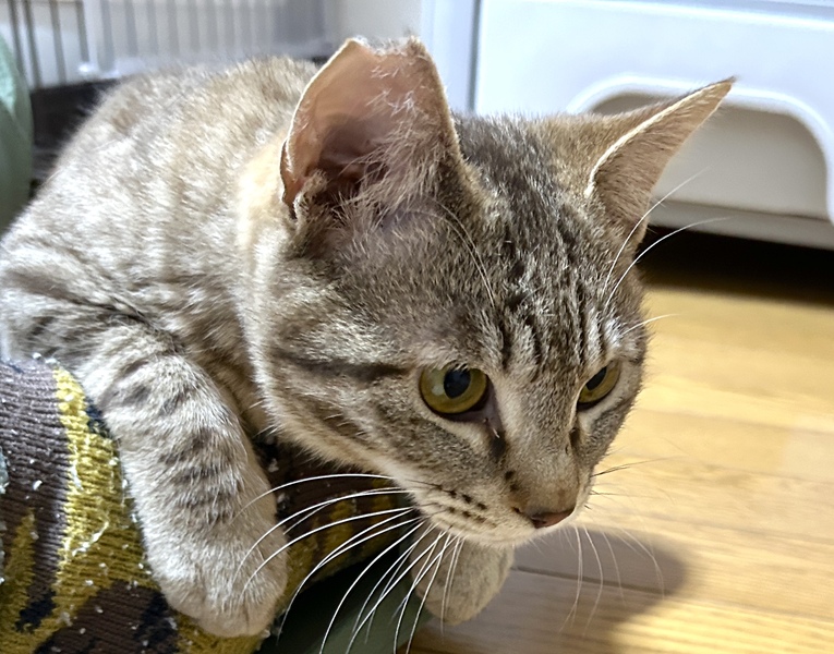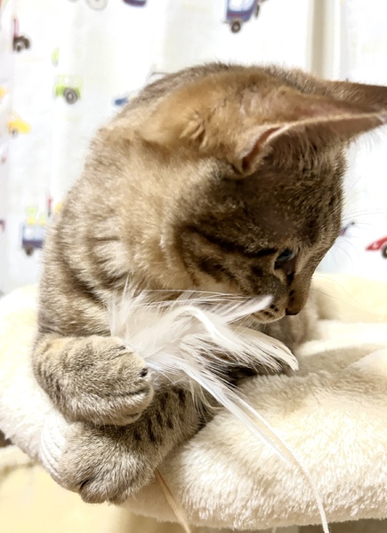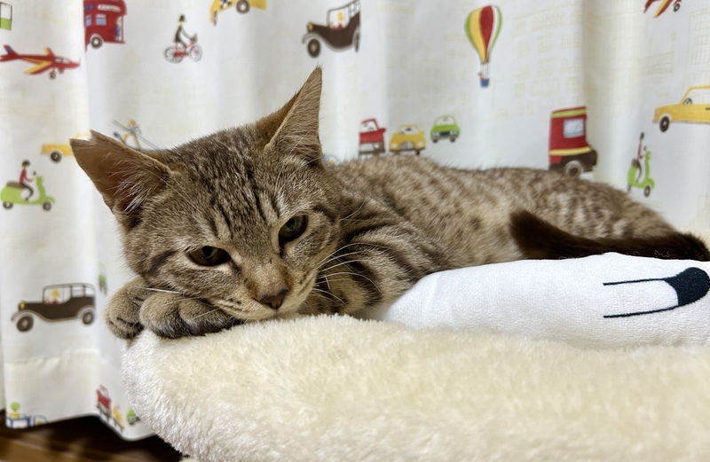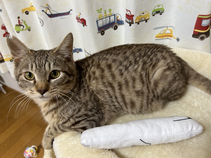 | 特徴(性格など) | 保護の次の日から撫でると甘えて擦り寄ってくれ、数日後にはお腹を見せて甘えてくれました。 ごはんもよく食べて最近では部屋を探索して遊んでいます。 猫じゃらしやリボンなどのおもちゃが大好きでとても良く遊びます。 甘えたで無邪気で可愛いキジ柄男の子です。 |