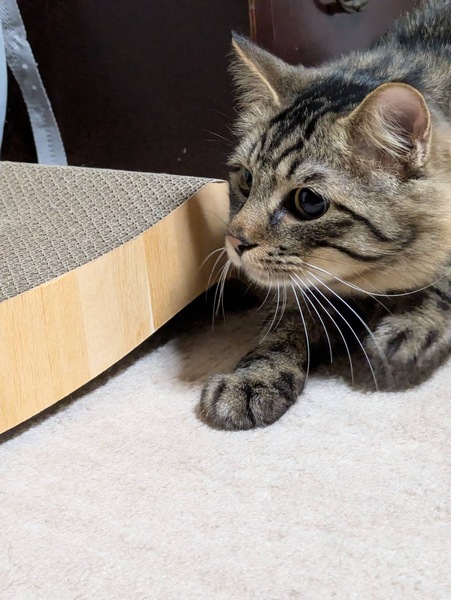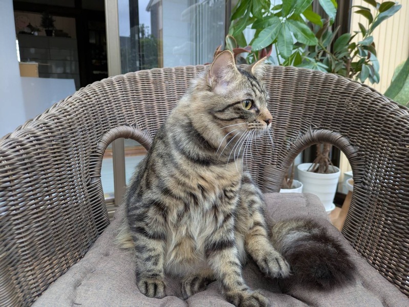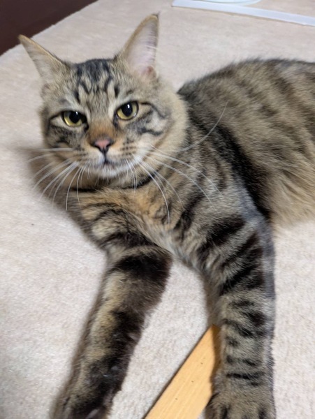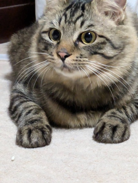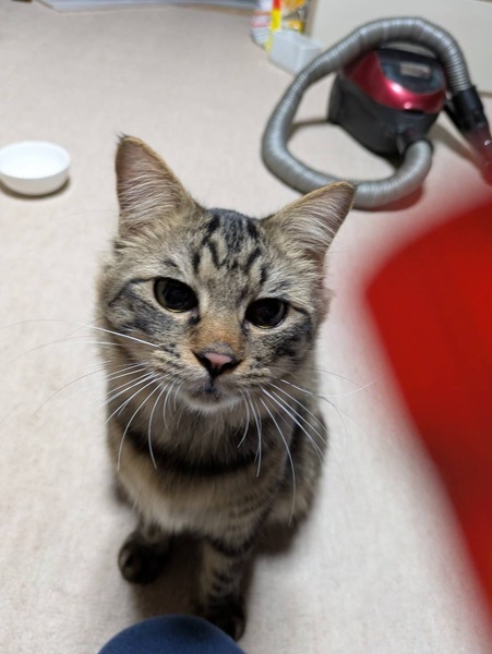 | 特徴(性格など) | 性格 元野良猫だとは思えないほどの人懐っこさで、とにかく人が大好き!!! よく人間のストーカーをします。笑 約1歳と若いので元気いっぱいです! 特徴 ・半長毛 長毛になる可能性もあり。 ・キジトラ ・目の形、目と目の距離が近いところ。 |