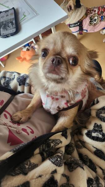 | 特徴(性格など) | 【仮名】ミルコ 【性別】女の子 【犬種】ロングコートチワワ 【年齢】2020.12.8産まれ 【体重】3.4kg 【トイレ】練習中 【お散歩】練習中 【留守番】できます 【トリミング】月に1回程度のシャンプー 【健康状態】パテラ左右共にグレード3 右目に傷があり点眼中 【お薬】2種類の点眼薬 【詳細】天真爛漫、活発で人が大好きです。初めての人にもしっぽフリフリ、抱っこして触ってーとアピールしています。他犬とも仲良くできます。 右目の傷は点眼中。近々再診予定です。点眼薬は嫌がらずさせてくれます。 |